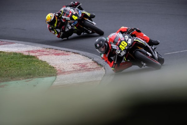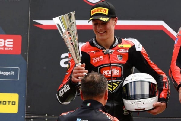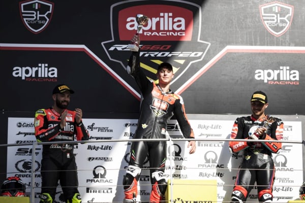 Nella prima gara di sabato pomeriggio, un altro colpo di scena ha immediatamente animato il weekend, ovvero la caduta di Francesco Mongiardo nei primi giri di gara data probabilmente da una noia tecnica. Lotta dura nelle posizioni del podio con Max Toth, Giuseppe De Gruttola, Lorenzo Sommariva e Kaleb De Keyrel. Dieci giri di passione tra i quattro con continui scambi di posizione e staccate al limite, del tutto pulite ma più che mai decise. Sotto la bandiera a scacchi è stato Max Toth a trionfare con quattro decimi su De Gruttola del team Terra & Moto, terzo Lorenzo Sommariva davanti al pubblico di casa e dopo la rimonta dalla terza fila dello schieramento. Quarta piazza per un buon Kaleb De Keyrel, in piena crescita e anche leader della corsa in alcuni momenti, quinto Yari Favero. Prima vittoria in assoluto per Max Toth e prima vittoria americana nel Trofeo Aprilia RS660.
