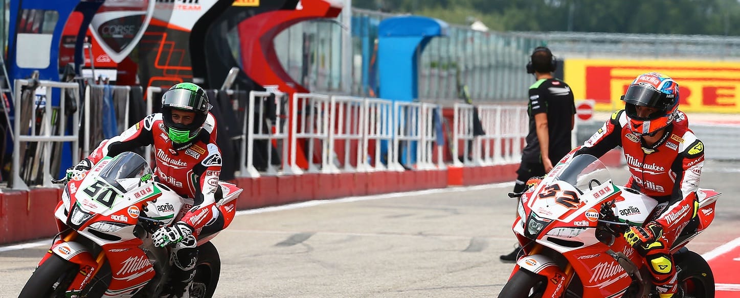 Eugene Laverty, moto n. 50. Griglia 10°. Gara 2: 6°, 10 punti: “Oggi abbiamo ottenuto un risultato positivo considerando che siamo dovuti partire in P10, e questa volta le regole inverse della griglia non ci hanno aiutati. È stata una gara combattuta e interessante e il feeling era ottimale. Grande il miglioramento di oggi con lo pneumatico anteriore; ieri ho avuto qualche problema che non era normale, mentre oggi ha funzionato correttamente e ho potuto spingere molto di più. Forse avremmo potuto ottenere la 5ª posizione se fossimo partiti più avanti, ma continuo a pensare che sia stata la nostra gara migliore dell’anno. Per il test di Lausitzring possiamo lavorare su ottime basi. Il miglioramento sull’anteriore ha portato un notevole vantaggio, come abbiamo dimostrato nelle prove libere, e puntiamo a fare un altro grande passo avanti con la RSV4 RF”.