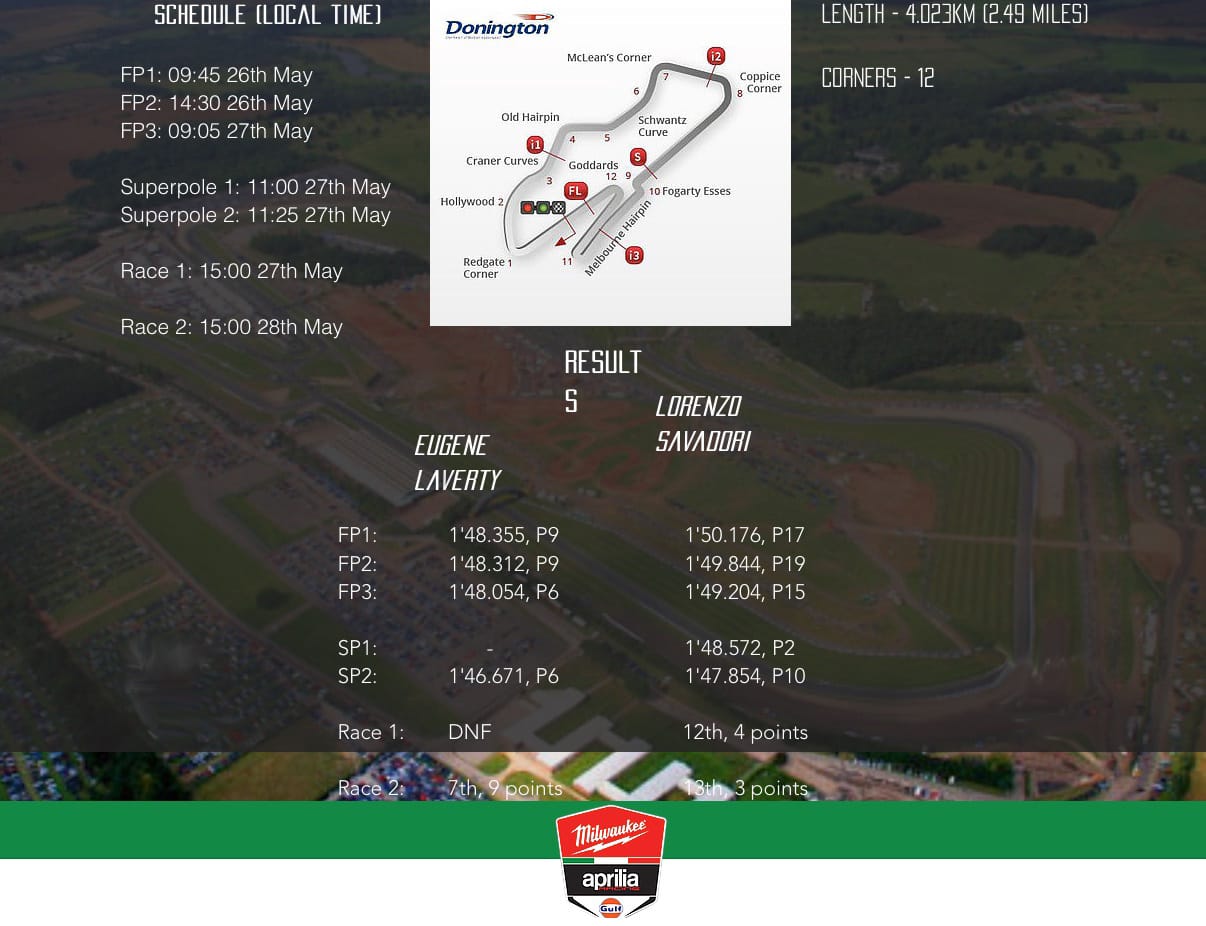 RISULTATI ROUND 6, DONINGTON PARK, UK, 26-28 MAGGIO 2017: Eugene Laverty, moto n. 50. GARA 1: ritirato. GARA 2: 7° posto, 9 punti. Lorenzo Savadori, moto n. 32. GARA 1: 12° posto, 4 punti. GARA 2: 13° posto, 3 punti.