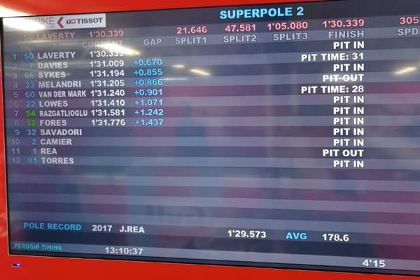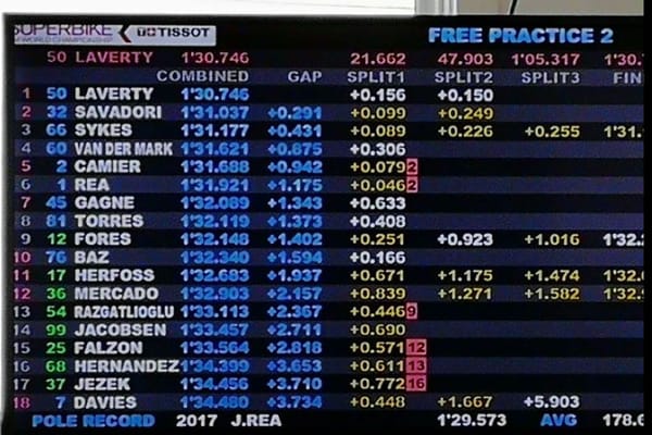 CRONACA DELLA GARA 2. Una partenza veloce dal P5 sulla griglia ha spostato Eugene Laverty in terza posizione dietro Fores e Rea alla Curva 2. Spingendo forte prima della sosta obbligatoria al pit stop sul Giro 10, Eugene ha superato entrambi i piloti alla Curva 4 ed è passato in testa prima della fine del primo giro, distanziando Rea di 1,119s. Mentre gli avversari lo inseguivano, Eugene ha mantenuto il suo ritmo e ha concluso il secondo giro a 1,227s davanti a Camier.
