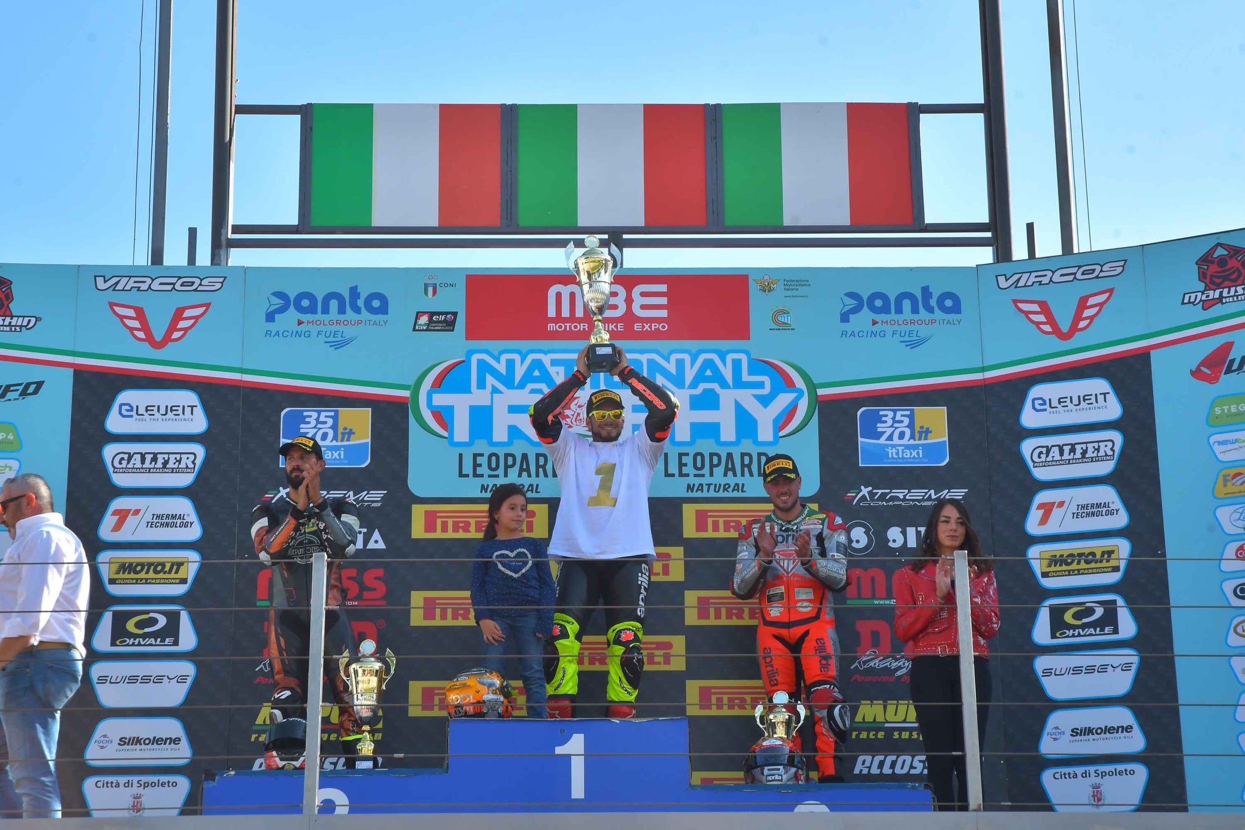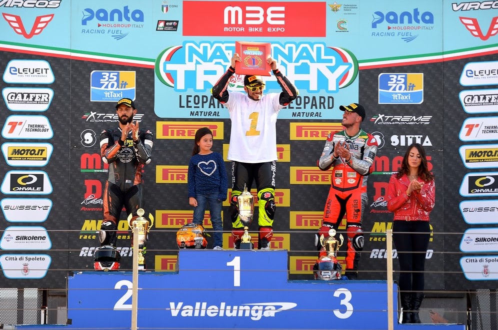 NATIONAL TROPHY. Scatta molto bene Eddi La Marra in sella alla sua Aprilia in livrea speciale color oro per celebrare il campionato vinto con un round di anticipo. Il Ferentino dalla terza casella della griglia mette lo scarico della nuova V4 di Noale subito davanti a tutti riuscendo a mantenere il primo posto dal primo all’ultimo giro. La Marra vince la gara portando i successi a cinque su sette gare disputate, un campionato dominato a conferma dell’ottimo progetto Aprilia RSV4 1100 Factory.