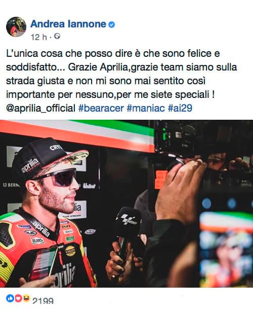 ANDREA IANNONE (moto n. 29): "E' stata una gara nel complesso positiva. Al mio debutto con Aprilia abbiamo finito a 14 secondi dal primo, questo significa che abbiamo lavorato bene. Non sono mancate le difficoltà: alla prima curva ho perso l'ala sinistra a causa di un contatto, e questo non ha certo aiutato.