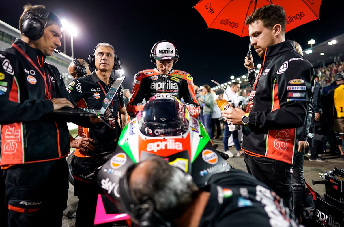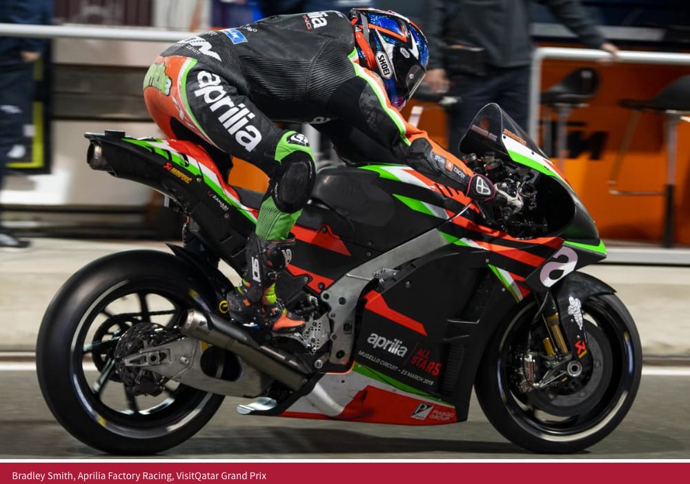 Bradley Smith ha concluso la gara anzitempo per una scivolata senza conseguenze fisiche a due giri dalla bandiera a scacchi. Per il pilota inglese e il test team è stata la prima uscita in gara e il weekend lascia una grande mole di dati e di risultati sulle molte prove effettuate. Dati che saranno materiale prezioso per i prossimi step di crescita della RS-GP 19, una moto che nella notte del Qatar ha mostrato ottime potenzialità.