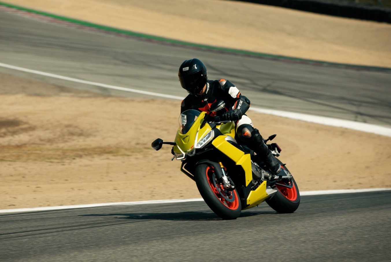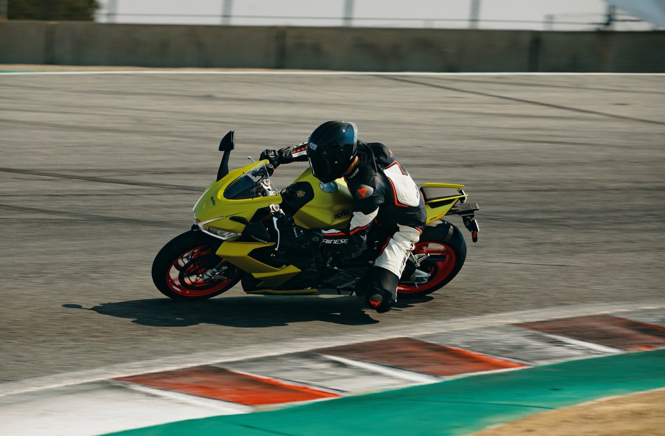 Il pilota Rennie Scaysbrook su Aprilia RS 660 a Laguna Seca, tra i cordoli della pista più famosa della California.