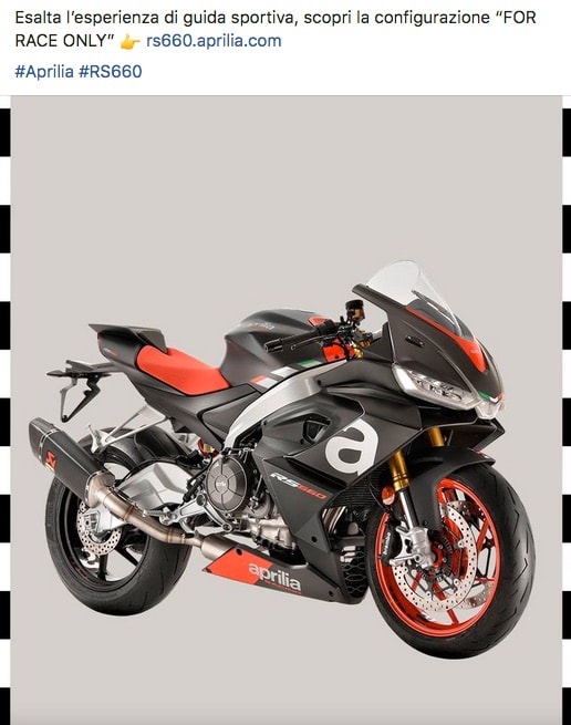 Aprilia RS 660 è una moto che, anche nella versione stradale, garantisce il massimo piacere di guida grazie a una ciclistica rigorosa, in perfetto stile Aprilia, e grazie al nuovo bicilindrico da 660 cc dalla potenza record di 100 CV. Una moto facile, leggera e divertentissima, destinata a far innamorare nuove e giovani generazioni di motociclisti e che, nella sua versione da pista si annuncia come ideale per traghettare i piloti più giovani dalle cilindrate e dalle potenze di esordio verso mezzi più performanti, favorendone e accompagnandone il percorso di crescita in gara e nella gestione di un intero campionato.