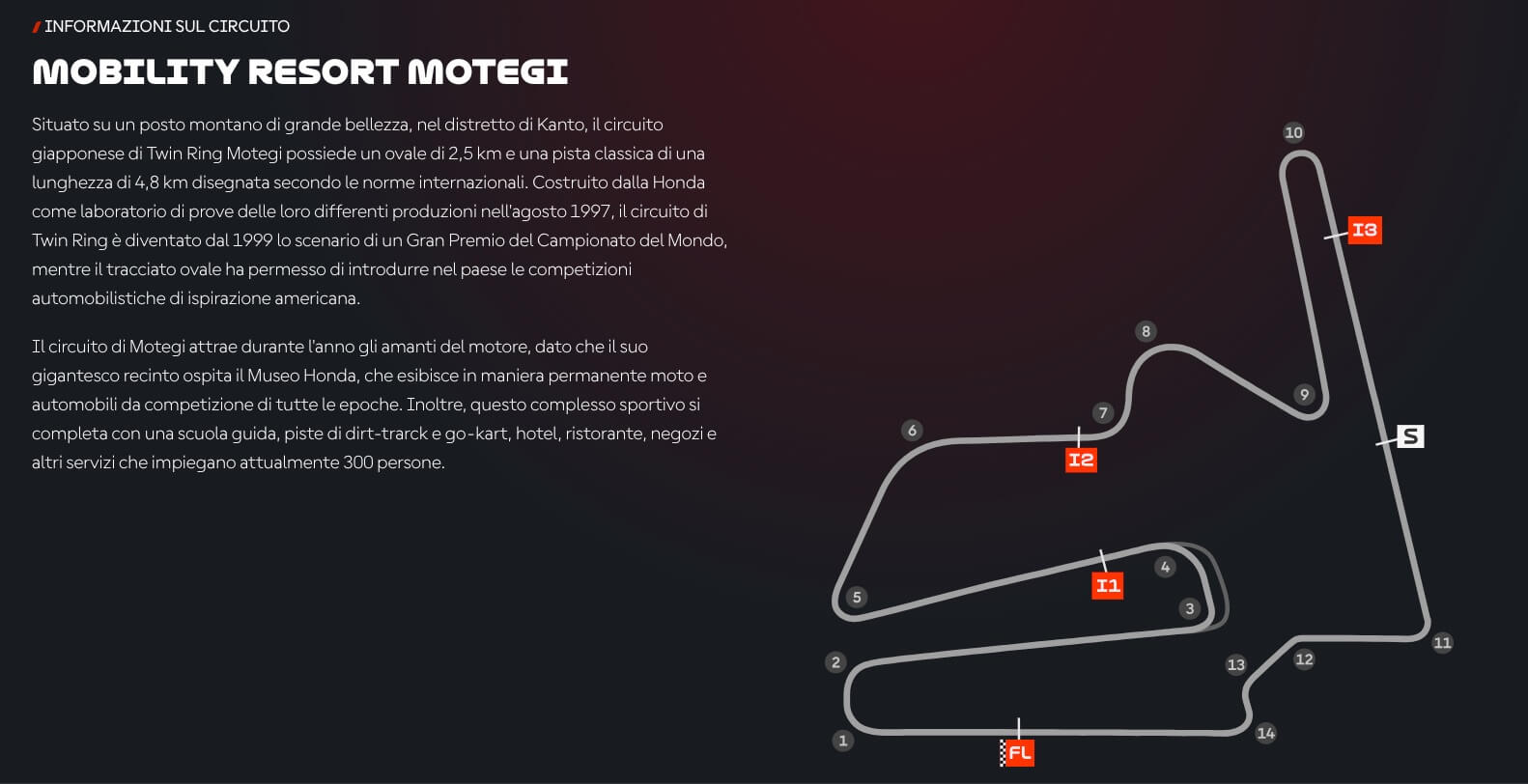 Il Circuito Mobility Resort Motegi, precedentemente noto come Twin Ring Motegi, presenta una configurazione molto particolare, caratterizzata da poche curve veloci e molte curve lente, intervallate da rettilinei. Con una lunghezza di 4.800 metri, 8 curve a destra e 6 a sinistra, questo tracciato “stop & go” è tra i più impegnativi per i freni.