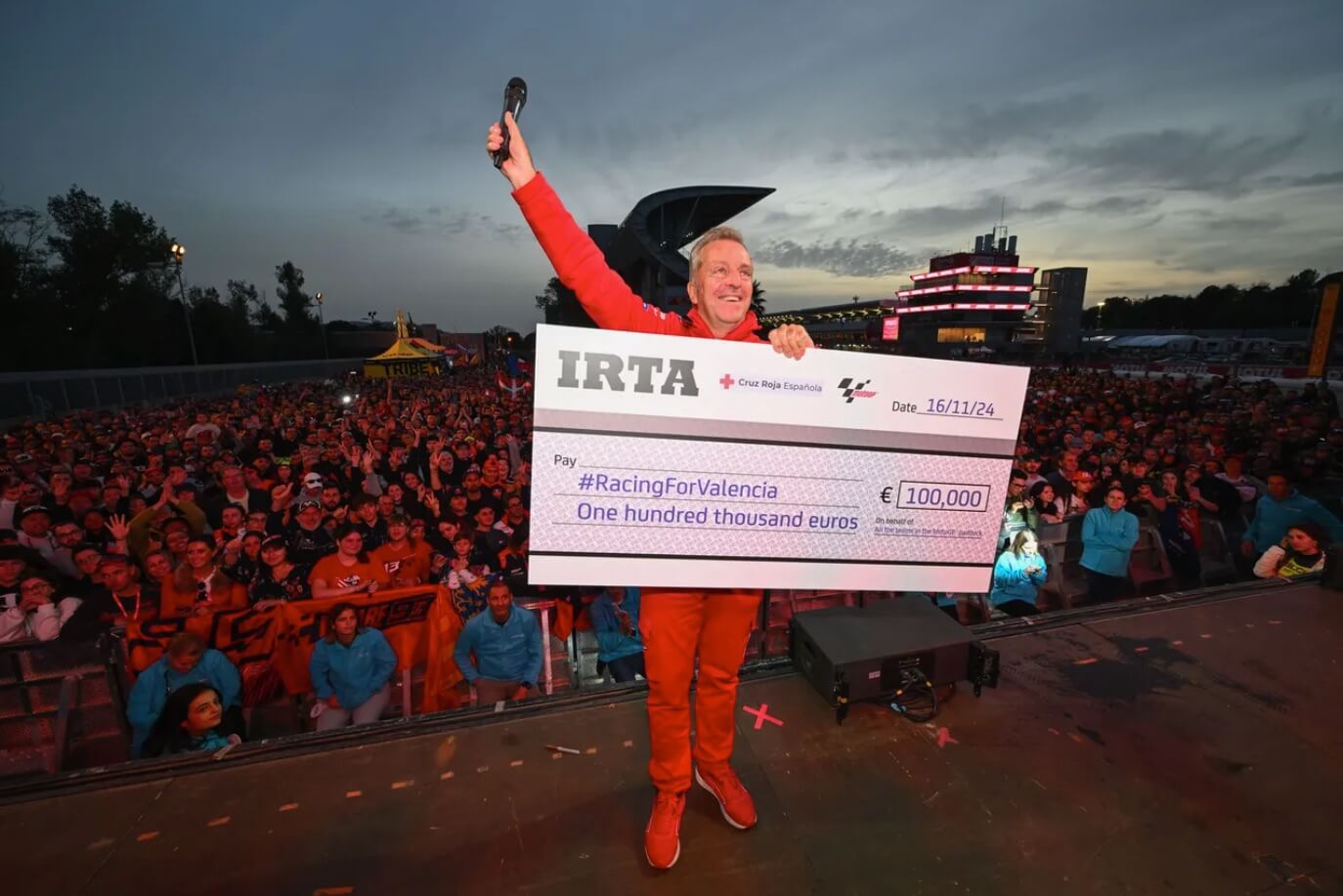 9 dicembre 2024, comunicato MotoGP™: Il contributo totale della MotoGP™ alla nostra raccolta fondi Racing for Valencia è stato confermato in 1,6 milioni di euro. La cifra deriva dalle iniziative in termini di raccolta fondi sia in occasione del Gran Premio Motul della Solidarietà di Barcellona che online; donazioni effettuate in occasione della nostra campagna e una cifra finale di un milione di euro aggiunta al totale da parte di Dorna Sports, titolare dei diritti della MotoGP™.