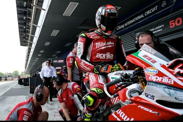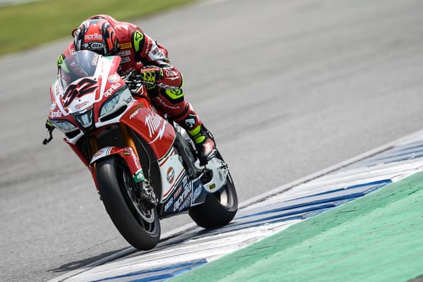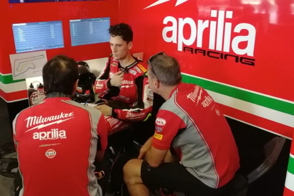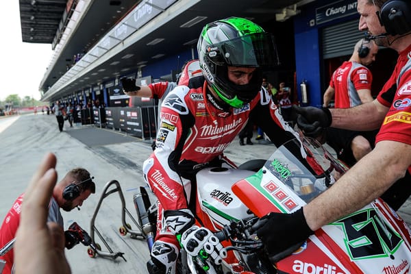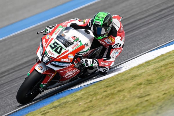 Chang International Circui, (Thailandia), 24/3/18 – Sabato, a Chang, Milwaukee Aprilia ha disputato un'impegnativa Gara 1, durante la quale i piloti Eugene Laverty e Lorenzo Savadori sono comunque riusciti a ottenere buoni risultati nonostante alcuni problemi in pista. In Superpole 1 Lorenzo ha lottato per la pole position, dato che i suoi tempi di prova non erano sufficienti a garantirgli automaticamente un posto. Il risultato non è mancato: percorrendo il suo giro più veloce a 1'33,956 negli ultimi istanti della sessione, si è guadagnato il meritato posto in Superpole 2. Il compagno di squadra Eugene è stato il primo pilota in pista in SP2, inizialmente il più veloce, prima che il resto del gruppo iniziasse ad accelerare il ritmo e i tempi sul giro calassero. Con il miglior giro di 1'33,119 ottenuto nell'ultima manche, ha ottenuto l’8a posizione in una griglia molto serrata, a 0,3 dalla pole position. Lorenzo ha completato solo due giri nella sessione, per conservare le forze per la gara. Con un giro di 1'33,450 alla sua prima manche, ha ottenuto una rispettabile 11a posizione.