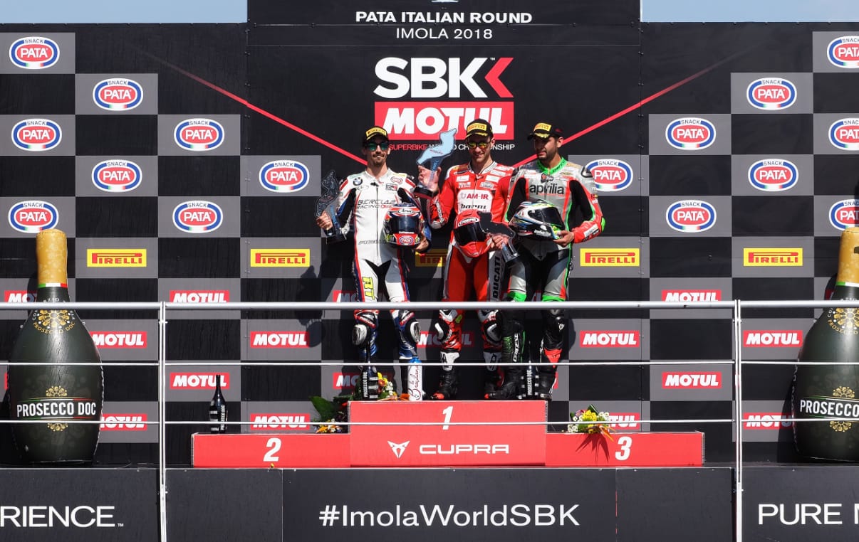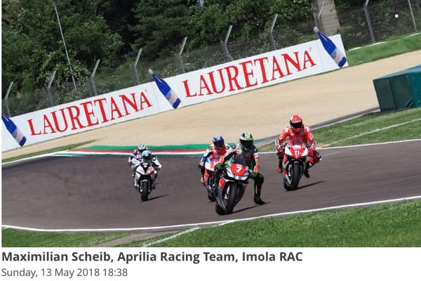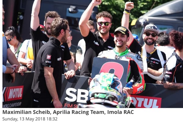 Imola (Italia), 13 maggio 2018 – Gara di casa da protagonista per l'Aprilia Racing Team, che coglie il secondo podio consecutivo nella Superstock 1000 sul circuito Enzo e Dino Ferrari di Imola. Il cileno Maximilian Scheib, che scattava dalla pole position conquistata ieri, ha portato la sua RSV4 FW-STK al terzo posto, dopo aver lottato nel gruppo di testa durante tutti i 14 giri di gara. Dopo il podio di Assen, questo secondo risultato positivo accende le mire in ottica campionato per Scheib, ora terzo nella classifica piloti.