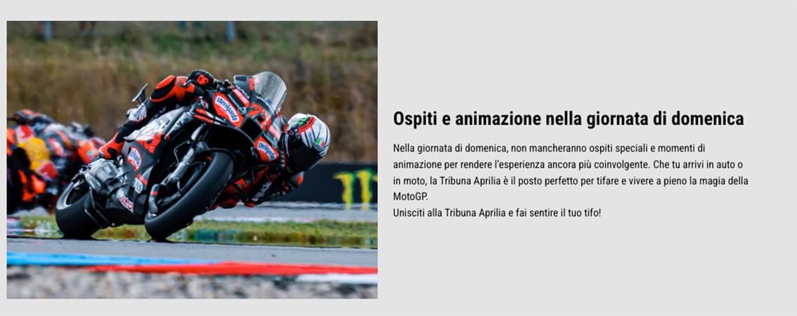 Luglio 2025 - “A Misano torna la Tribuna Aprilia: vivi in prima fila le emozioni della MotoGP” è l’annuncio sul sito Aprilia, con l’invito a tifare per il team Aprilia Racing ed i suoi piloti, al prossimo GP di San Marino, in programma al Misano World Circuit, dal 12 al 14 settembre 2025.