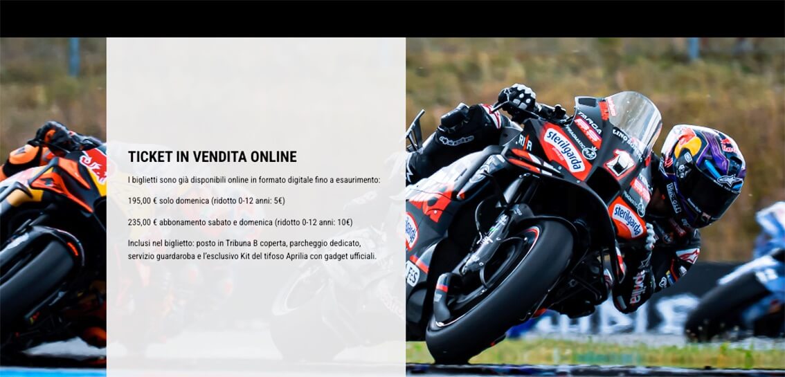 I BIGLIETTI. Biglietti già in vendita online, fino ad esaurimento; sono inclusi nel biglietto: posto in Tribuna B coperta, parcheggio dedicato per auto e moto, servizio guardaroba, esclusivo kit del tifoso Aprilia con gadget ufficiali.