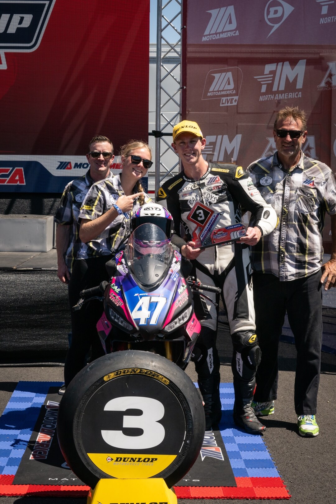 Avery Dreher / Bad Boys Racing: “Devo fare un grande applauso al team. Tenevo molto a correre la mia gara al meglio. Gli pneumatici hanno tenuto bene all’inizio (…). Questa è per me la terza moto della stagione, è piuttosto difficile cambiare da una moto all’altra; perciò, sono molto contento del risultato (3° sul podio, ndr) oltre la mia aspettativa di voler solo finire una gara. Il piano era di provare a superare Hank [Vossberg] all’ultimo giro, ma si è messo sulla difensiva, quindi onestamente l’ho lasciato fare. Non riuscivo a superarlo nell’ultimo settore, è stata dura. Sono entusiasta della terza posizione qui a The Ridge, ieri è stata una gara difficile, quindi è un bel recupero”.