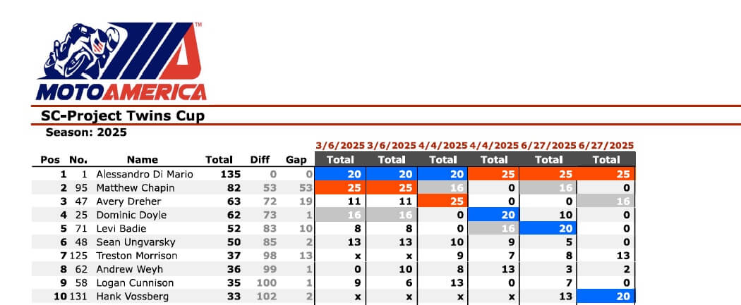 La prossima tappa della MotoAmerica Twins Cup è prevista dall’11 al 13 luglio al circuito di WeatherTech Raceway Laguna Seca di Monterey, California.