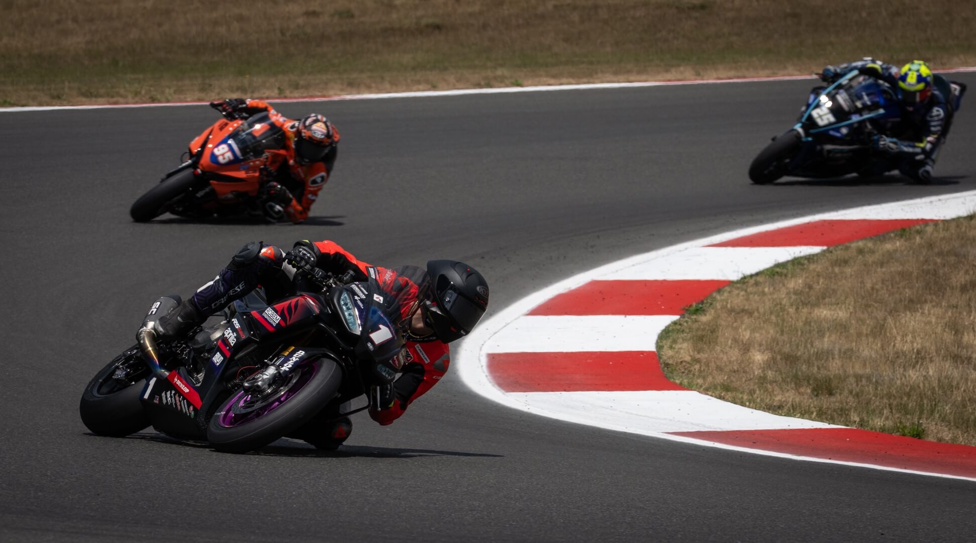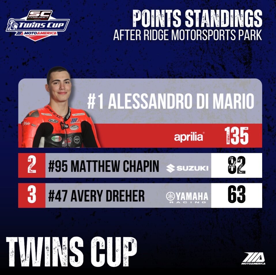 Nella gara 1 di sabato Di Mario ha corso come leader indiscusso fino alla vittoria. Dopo l’holeshot ha dettato il ritmo della corsa rimanendo in testa per tutti i 12 giri, e tagliando il traguardo con un vantaggio di 12,491 dal secondo classificato. Gli altri piloti Aprilia a concludere nella top 10 sono stati Vossberg quarto nella sua prima gara in Twins Cup, Cyr settimo, Cunnison nono e Foster decimo.