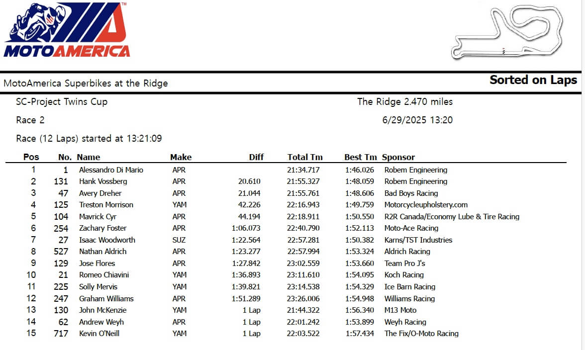 La gara 2 di domenica ha visto Di Mario leader con prestazioni dominanti che gli hanno valso un margine di vittoria di oltre 20 secondi ed un nuovo record di 1:46,026 nel 2° giro. Soltanto alla sua seconda partenza nella Twins Cup, Vossberg è passato dalla sesta alla terza posizione prima di concludere il 3° giro, per poi passare il resto della gara a combattere con Dreher per il secondo posto. È stato Vossberg a guadagnare la seconda posizione al 7° giro. Dopo una lotta serrata, i due piloti Aprilia hanno tagliato il traguardo con un vantaggio di Vossberg di 0,434 su Dreher, conquistando una tripletta tutta Aprilia RS 660. Altri quattro sono arrivati nella top 10: Cyr quinto, Foster sesto, Nathan Aldrich di Aldrich Racing ottavo e Jose Flores di Team Pro J nono.