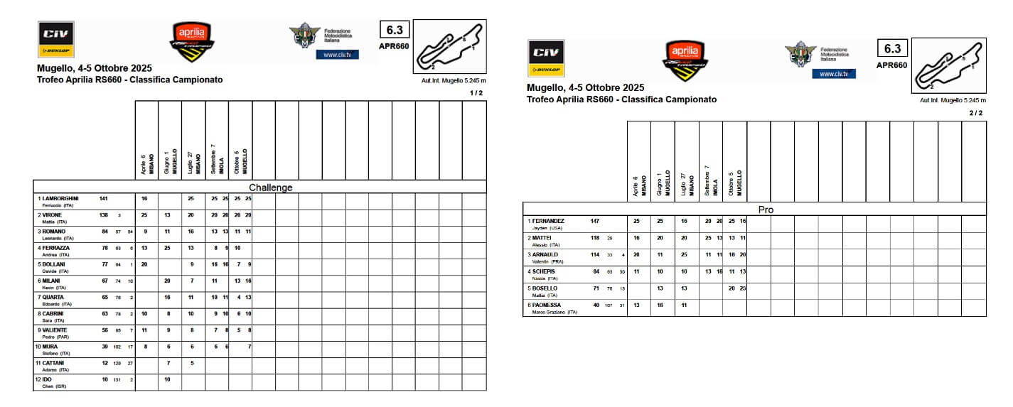 Ottobre 2025 – La stagione 2025 – quinta edizione del Trofeo Aprilia RS 660, in ambito CIV-Campionato Italiano Velocità – si è conclusa al Mugello con Ferruccio Lamborghini Campione classe Challenge, Jayden Fernandez vincitore della classe Pro.