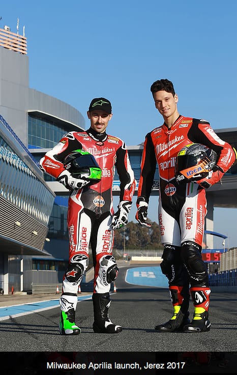 Jerez de la Frontera (Spagna), 24 gennaio 2017 – Il team Milwaukee Aprilia che compete nel World SBK 2017 è stato ufficialmente lanciato sul circuito di Jerez in Spagna. In posa con le loro nuove Aprilia RSV4 RF, i piloti Eugene Laverty e Lorenzo Savadori sono stati presentati alla stampa internazionale, segnando la prima apparizione pubblica della nuova moto. Il team WSBK 2017 rappresenta l'unione della squadra inglese SMR (Shaun Muir Racing) con Aprilia Racing, una prima assoluta per entrambi. Due volte campione del British Superbike, il team SMR ha debuttato in Superbike nel 2016, e ora punta alla stagione 2017.