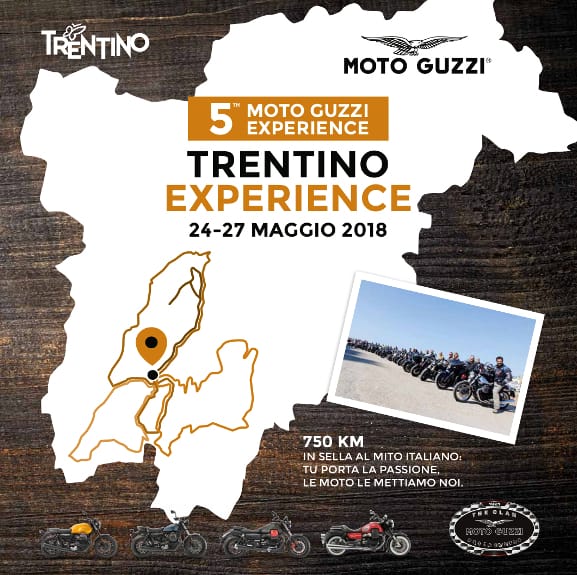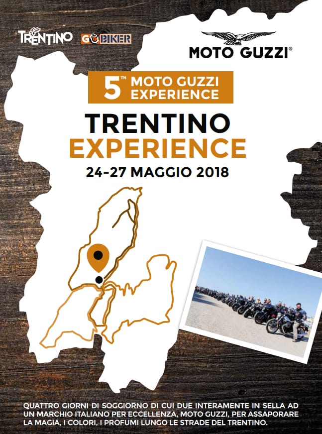 Moto Guzzi Experience cambia meta: a maggio il tour è in Trentino, dal 24 al 27. Moto Guzzi Experience è l’avventura in Moto Guzzi dedicata a chi vuole vivere uno stupendo viaggio su due ruote, in compagnia di bikers appassionati, percorrendo strade emozionanti e assaporando panorami incantevoli. 150 fortunati bikers, in 4 edizioni, hanno già provato sulla propria pelle le emozioni di questo viaggio indimenticabile di 4 giorni in sella al mito italiano, fino a questo momento dedicato alle magnifiche strade del Sud della Sardegna. Ma ecco la grande novità: dal 24 al 27 maggio 2018 la Moto Guzzi Experience cambia ambientazione! Dal sud al nord Italia, dal Mar Tirreno alle Dolomiti, dai piatti di pesce alla succulenta cucina montanara, da Is Molas-Sardegna a Comano Terme-Trentino!