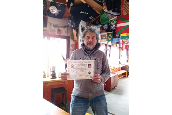 “Io sono un biker da strada, Guzzista Californiano, e non amo particolarmente l’off road, ma per questo viaggio impegnativo ho dovuto organizzarmi e quindi ho scelto la Stelvio, perfetta, ruote Pirelli Skorpion rally tassellate; poi, per l’ultima parte del viaggio le ho sostituite con pneumatici da asfalto”. Club “Fin del mundo”. Arrivati a Ushuaia, nella Terra del Fuoco, ai motociclisti rilasciano un certificato ufficiale della ‘Comunitad Internacional Motero Ejemplar’ (Comunità Internazionale Motociclista Esemplare: rispetto, fraternità, lealtà); ci sono tantissimi motociclisti di ogni dove, l’atmosfera è emozionante, si scambiano racconti ed esperienze, storie dei viaggi in moto. Si incontrano persone davvero speciali”.