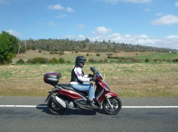 Amanda Hunter sul suo Piaggio Beverly durante il viaggio in Tasmania.