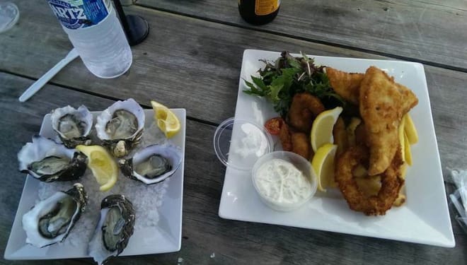 Strahan Village - Accommodation in Strahan, TasmaniaGiorno 7 – Da Bruny Island a Port Arthur, 188 km. Clima fantastico e tutto quello che si vede in questa foto è stato un pranzo di pesce da AUD $ 26 (26 dollari australiani), assolutamente meraviglioso.