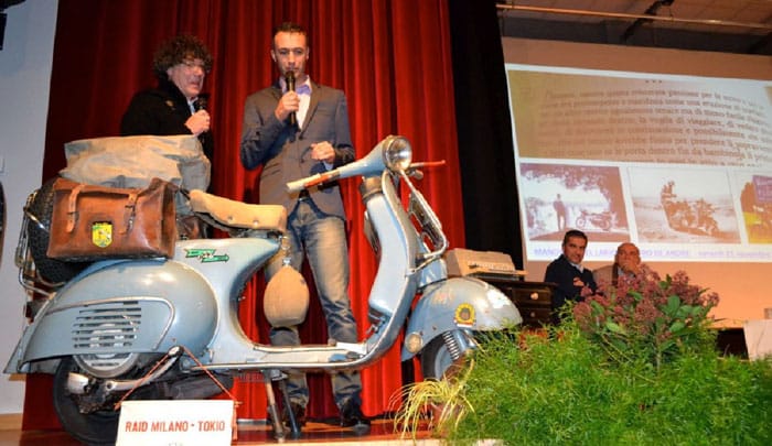 Mandello del Lario, patria di Moto Guzzi, ha reso omaggio a Roberto Patrignani, nel giorno del suo compleanno, il 21 novembre scorso, per ricordare il cinquantesimo anniversario del suo famoso viaggio in Vespa da Milano a Tokyo. Pilota con all’attivo due Milano-Taranto, due Giri d’Italia, tre volte classificato al Tourist Trophy, primatista mondiale con la Moto Guzzi 1000 e il Garelli 50 e 150 gare disputate, fino al 1989. Poi una serie di viaggi solitari (in Vespa, ma anche sul Dingo Cross, cinquantino da fuoristrada prodotto da Moto Guzzi tra il ’60 e il ’70, con cui andò in Africa) e un’intensa attività di giornalista e scrittore. Mandello gli ha dedicato una serata al teatro “De Andrè” tra ricordi ed emozioni, racconti e fotografie, filmati e testimonianze di tanti piloti, come quella di Angelo Tenconi (“re delle gare in salita”), che con Patrignani e altri grandi piloti portarono la Moto Guzzi V7 a battere record mondiali di durata sulla pista di Monza nella seconda metà degli anni Sessanta.