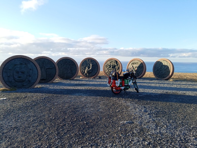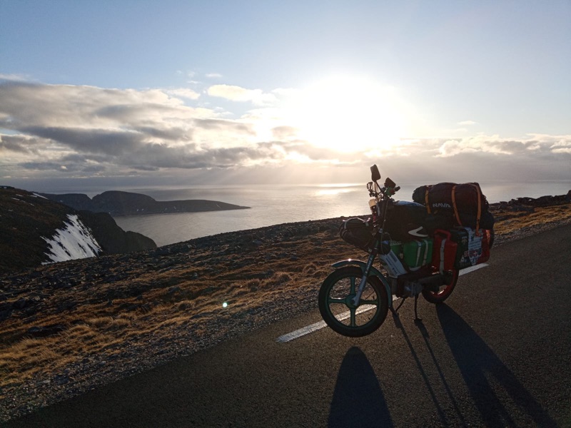 “I ricordi sono tanti, dalle Polizie di tutti gli Stati attraversati che mi fermavano solo per la curiosità di capire dove fossi diretto, alla coppia di camperisti che si fermò un centinaio di metri dopo di me, di colpo, vedendomi spingere Iachino a seguito di una delle tante forature mentre, stavo cercando uno spazio idoneo alla sostituzione della camera d’aria; mentre smontavo la ruota posteriore chiacchierando con il marito, la signora disse ‘la pasta è pronta’, appena preparata sul camper, e ci mettemmo a pranzare a bordo strada con il motorino smontato. Un altro ricordo al confine svedese: si fermò un pickup americano che trasportava bagagli di un gruppo di harleysti al seguito facendogli da guida; il guidatore mi disse che a pochi km da li c’erano delle pendenze ben superiori al 13% e che, così carico, non avrei potuto affrontarle; mi offrirono di salire a bordo: carico il motorino sul pickup, facendomi così scollinare quei 30 km che avrebbero inficiato la riuscita del viaggio, molto probabilmente rompendo il motore per lo sforzo che avrebbe subito dalle forti pendenze. Altro ricordo indelebile: gli ultimi 200 km da Nordkapp; si mise a nevicare, mi fermai in una sorta di osteria per ripararmi dal freddo, uno vide il motorino e fece uscire gli amici che erano all’interno a guardare con quale mezzo fossi arrivato fin lì e, capendo che ero partito da Palermo, mi offrirono da mangiare e bere (!), e ad ogni boccone erano brindisi e risate; non conoscendo il finlandese, capivo solo THE ITALIAN CRAZY”.