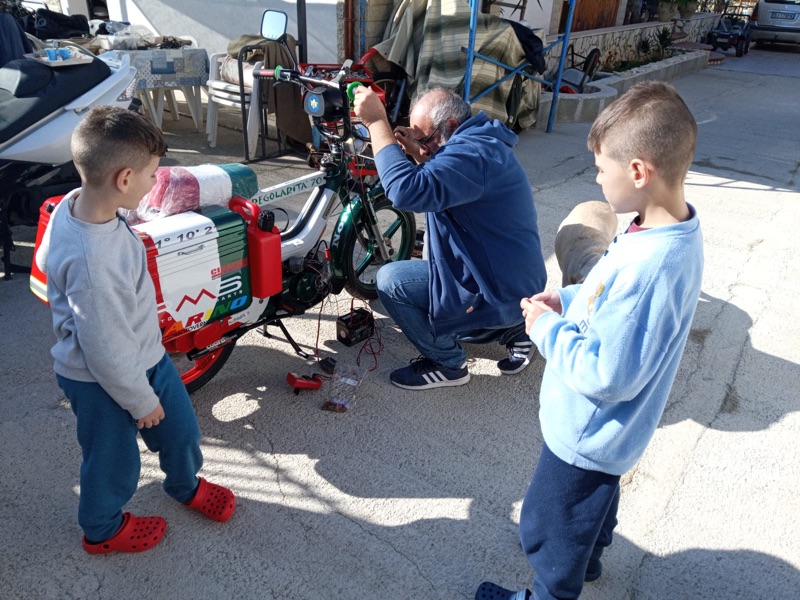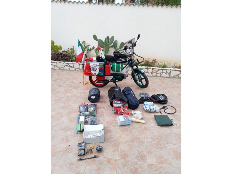 “Il grande interesse che ho suscitato lascia basito anche me; e devo dire che il ciclomotore, sin dal primo momento da quando è uscito dalla carrozzeria, montando l’esile motorino con il suo ‘ruggito’ che mi ha riportato indietro di 30 anni (a quel Ciao di nonno Mimmo) e che simpaticamente ho chiamato Iachino (giacchino in siciliano), ha destato stupore e ammirazione mista ad incredulità, con il mio avanti e indietro per le strade del paese (Villagrazia di Carini, Palermo), tra i rivenditori di accessori moto e visitando gli sponsor, tra i conoscenti increduli al vedermi in sella al Piaggino, sapendo che corro in moto da anni, tra campionati regionale e Italiano enduro… sapendo che sono notoriamente uno ‘smanettone’, vedendomi ogni giorno con il motorino a fare test su test… più mi guardavano più non ci credevano (!). Solo il giorno della partenza si sono resi conto che facevo sul serio: vedendomi caricare Iachino come un mulo in garage, con accanto il mio bmw gs con ben oltre 300 mila km di viaggi alle spalle, mi dicevano: ‘Dome', è una pazzia, sei in tempo: carica tutto sul gs!’.