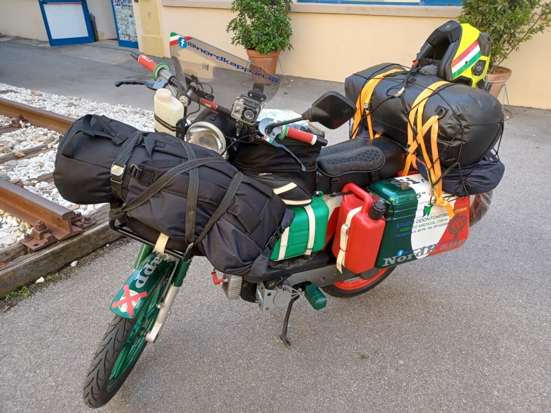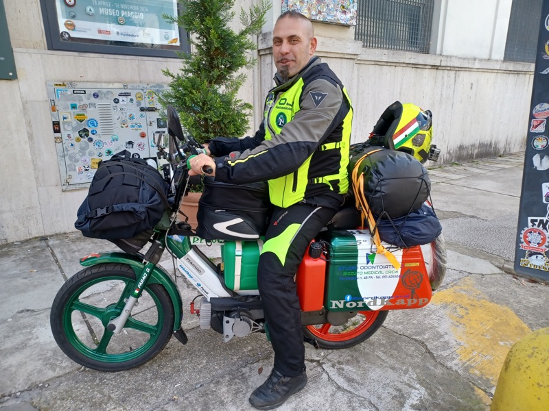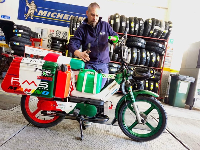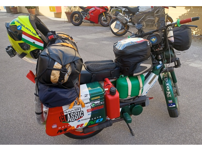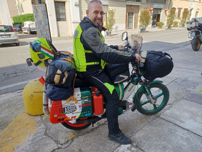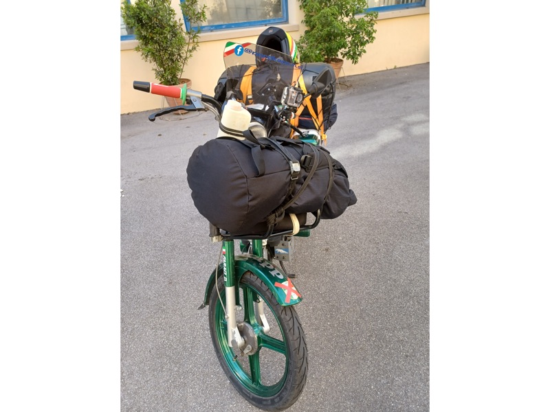 “Le principali difficoltà sono state dettate dal peso alla guida: le ruote esili, il vento e la massa che trasportavo… ogni camion o una semplice auto passando veloce, provocavano lo spostamento dell’aria e faceva si che non potevo distrarmi un attimo, per tenere ben saldo il manubrio e l’equilibrio dettato dalla bassa velocità; altra seria difficoltà erano le salite, sempre dettate dal peso ricordando che il ciclomotore era un 50cc e il peso in ordine di marcia di circa 170kg conducente compreso (su strada ho percorso km totali 5.230”.