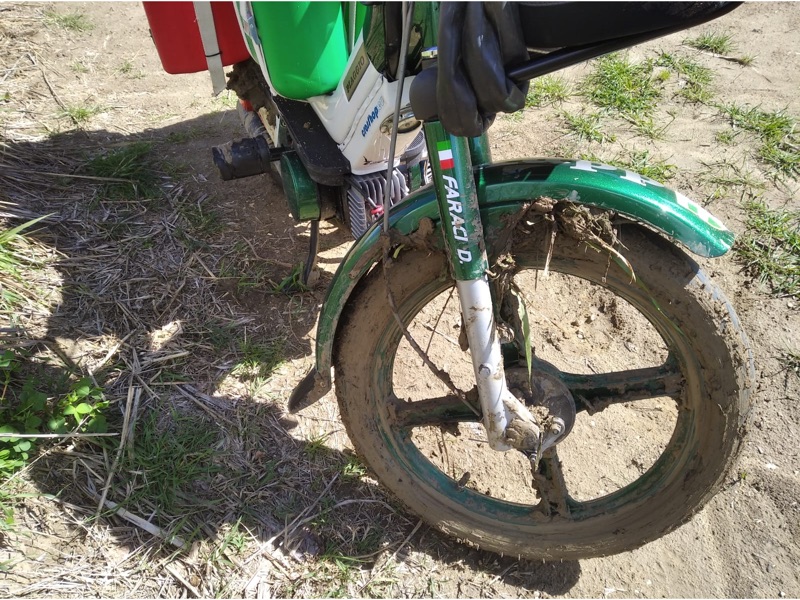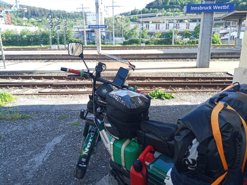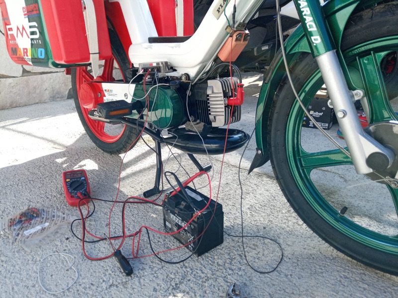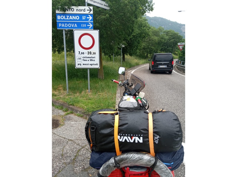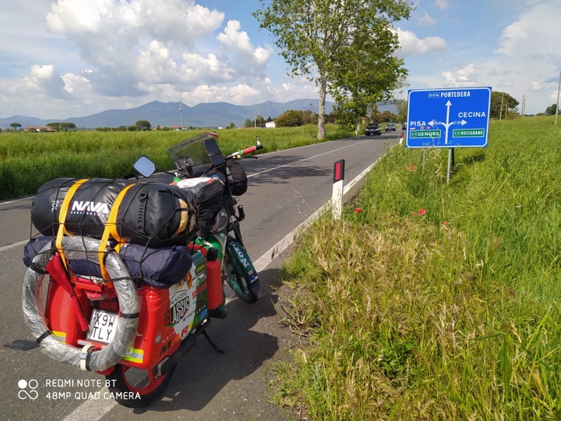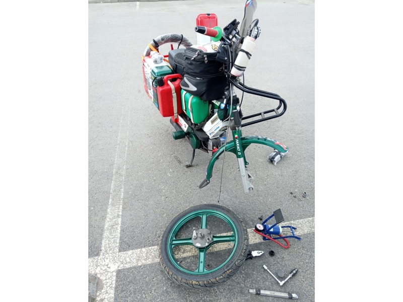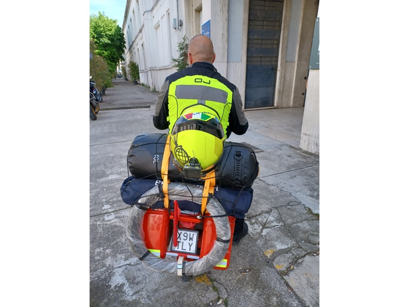 “Le principali difficoltà sono state dettate dal peso alla guida: le ruote esili, il vento e la massa che trasportavo… ogni camion o una semplice auto passando veloce, provocavano lo spostamento dell’aria e faceva si che non potevo distrarmi un attimo, per tenere ben saldo il manubrio e l’equilibrio dettato dalla bassa velocità; altra seria difficoltà erano le salite, sempre dettate dal peso ricordando che il ciclomotore era un 50cc e il peso in ordine di marcia di circa 170kg conducente compreso (su strada ho percorso km totali 5.230”.