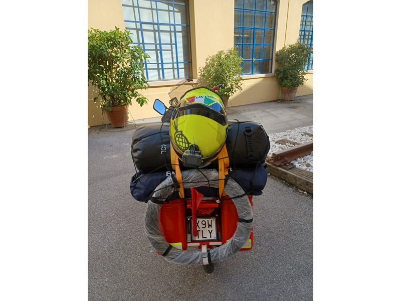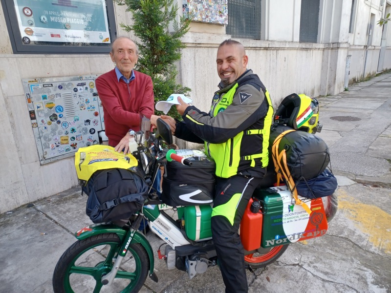 Ma non in moto, bensì con un ciclomotore Piaggio SI. Perché? Racconta Domenico: “Questo sogno ha radici profonde: risalgono a quando mio nonno Mimmo mi regalò (avevo 12 anni) un Piaggio Ciao, in seguito smontato e restaurato, dicendomi: ‘stai quieto e gioca con questo’. Ricordi ed emozioni ancora vivide”. Il Ciao si perse negli anni, ma a Domenico rimase l’idea di compiere un grande viaggio con un ciclomotore Piaggio simile a quello regalatogli decenni prima dal nonno. Ed ha incrociato un Piaggio SI.
