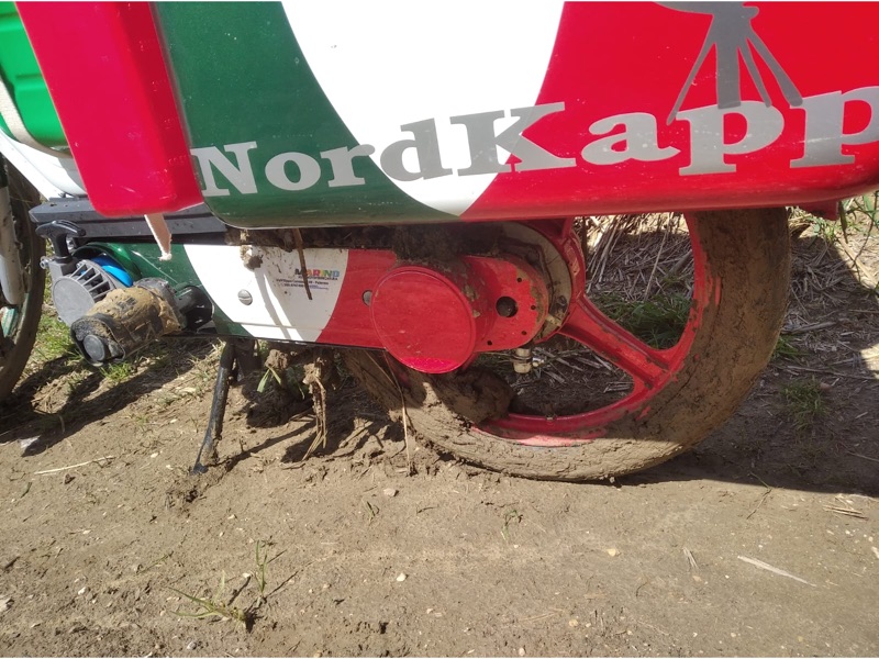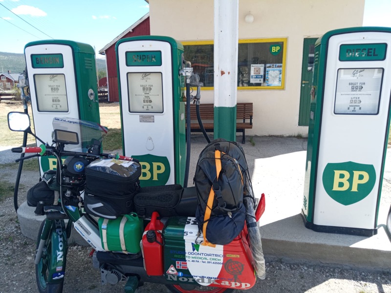 E io invece sempre più convinto: carico il Piaggino di tutto punto e uscendo di casa, certo non passavo inosservato: sia per quanto fosse carico e sia perché non si capiva più il modello e la cilindrata, tanto l’avevo trasformato. Arrivando al porto, mi guardavano tutti incuriositi: il personale della nave, abituato a caricare moto di grossa cilindrata, mi guardavano come fossi un tipo alieno. Di motociclisti ce n’erano tanti, tra foto e domande sia tecniche che logistiche, stavamo perdendo tutti la nave non accorgendoci del trascorrere del tempo davanti a quel motorino coraggioso, pronto ad affrontare una grande sfida. Ma di sicuro la cosa che ho notato, nell’arco di tutto il viaggio, era il silenzio di qualche secondo alla fatidica domanda DOVE SEI DIRETTO? E io con il mio ‘savoir fair arabo-normanno’ rispondevo A CAPO NORD! Ormai ci avevo preso gusto a vedere le facce dei vari interlocutori, e gustarmi quel silenzio che era misto a stima, rispetto, incredulità ma anche sospetto di pazzia, ma che mi incoraggiava in ogni momento, dove mi fermavo per un semplice panino, per fare benzina; anche in occasione delle svariate ‘rotture’ che mi sono capitate per strada e chiunque, dalla polizia a camperisti e motociclisti, si fermavano per darmi una mano, o anche solo per tenermi compagnia durante le riparazioni”.