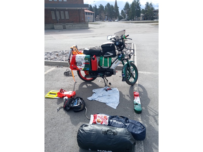 CAPITOLO 3: dal progetto alla road map. Continua Domenico: “Per darvi un’idea del tragitto, qualche numero: dalla Sicilia a Capo Nord, partendo il 10 maggio, attraversando 7 Nazioni (Italia, Austria, Germania, Danimarca, Norvegia, Svezia, Finlandia): oltre 11.700 km in totale, di cui 5.230 km il viaggio di andata in motorino, 6.500 km il ritorno in furgone; 2 traghetti; circa 140 litri di benzina consumati per il ciclomotore e 11 litri di olio; peso del ciclomotore 41 kg che, a pieno carico, diventano 180 kg, compreso il pilota. Durata del viaggio in totale: 25 giorni”. Road map in 20 tappe: Palermo-Livorno (nave); Livorno-Pontedera Museo Piaggio (45km); Pontedera-Trento (360 km); Trento- Gesserthausen (Germania, 360 km, la tappa più lunga, 10 ore); Gesserthausen-Bad Bruckenau (304 km); Bad Bruckenau-Braunschweig (273 km); Braunschweig-Kiel (275 km); Kiel-Viborg (Danimarca, 275 km); Viborg-Hirtshals (porto, 168 km e traghetto per la Norvegia); Larvik-Romendal (298 km); Romendal-Kvikne (261 km); Kvikne (Tovic Atlantic road)-Kristiansund (223 km); Kristiandund-Stjordal (244 km); Stjordal-Hàxàs (Svezia, 274 km); Hàxàs-Lycksele (246 km); Lycksele-Lulea (270 km); Lulea-Rovaniemi (Finlandia, Lapponia, 253 km); Rovaniemi-Saariselkà (257 km), Saariselkà-Lakselv (261 km); Lakselv-Nordkapp (Norvegia, 189 km).