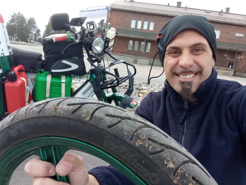 “Un’altra avventura! A 5 giorni dall’arrivo a Nordkapp lo spedizioniere che doveva organizzare il ritorno del motorino e il mio rientro in aereo su Palermo mi ha abbandonato, dicendo che le condizioni meteo inaspettate facevano variare l’importo della spedizione da 700 a 2.200 euro! Così da Palermo, mio fratello Emanuele ha noleggiato un furgone e in 5 giorni è arrivato a Nordkapp: abbiamo caricato Iachino e siamo scesi fino in Sicilia per altri ben 6.500 km, alternandoci alla guida dovendo rientrare a lavoro urgentemente e avendo sforato le ferie programmate”.