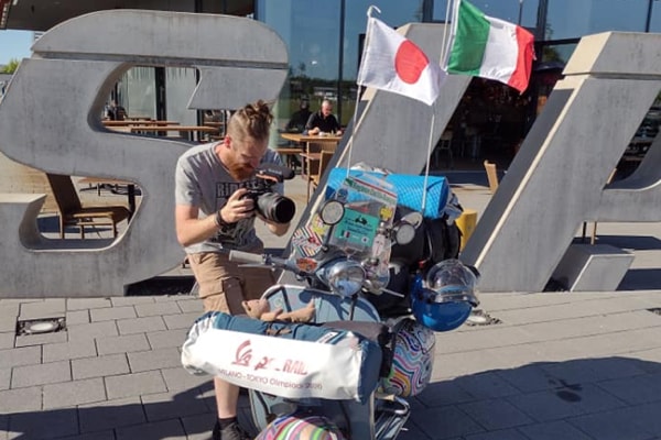 VESPA D’ARTISTA CON IL TOCCO DI LUCA MORETTO. Bagaglio essenziale, bandierine italiana e giapponese, i cerchi olimpici sul parabrezza, schienale supplementare per affrontare in tanti chilometri in sella, luci aggiuntive.