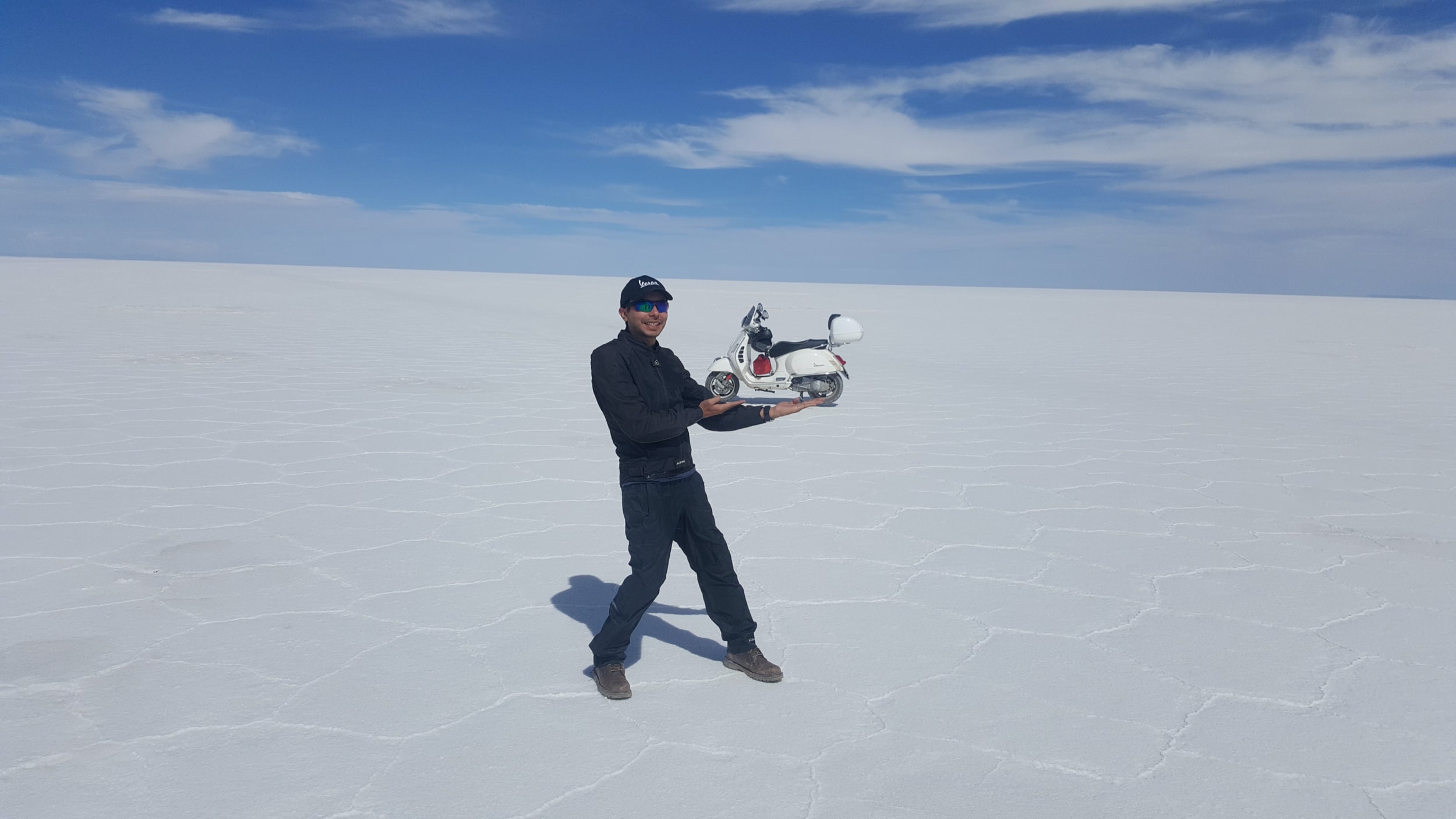 Raccontaci qualcosa in più su questo fantastico viaggio… “Innanzitutto, ho deciso di andare in vacanza al Salar de Uyuni (il più alto e grande deserto di sale del mondo) perché è la principale destinazione turistica del mio Paese. Poi, mi è venuto in mente di andarci in Vespa, un'idea che ho condiviso e commentato con alcuni amici, che hanno finito per sostenere. Personalmente, ero un po’ spaventato perché non sapevo come la Vespa avrebbe reagito su un percorso di 2.500 km con condizioni climatiche e di altitudine così diverse.