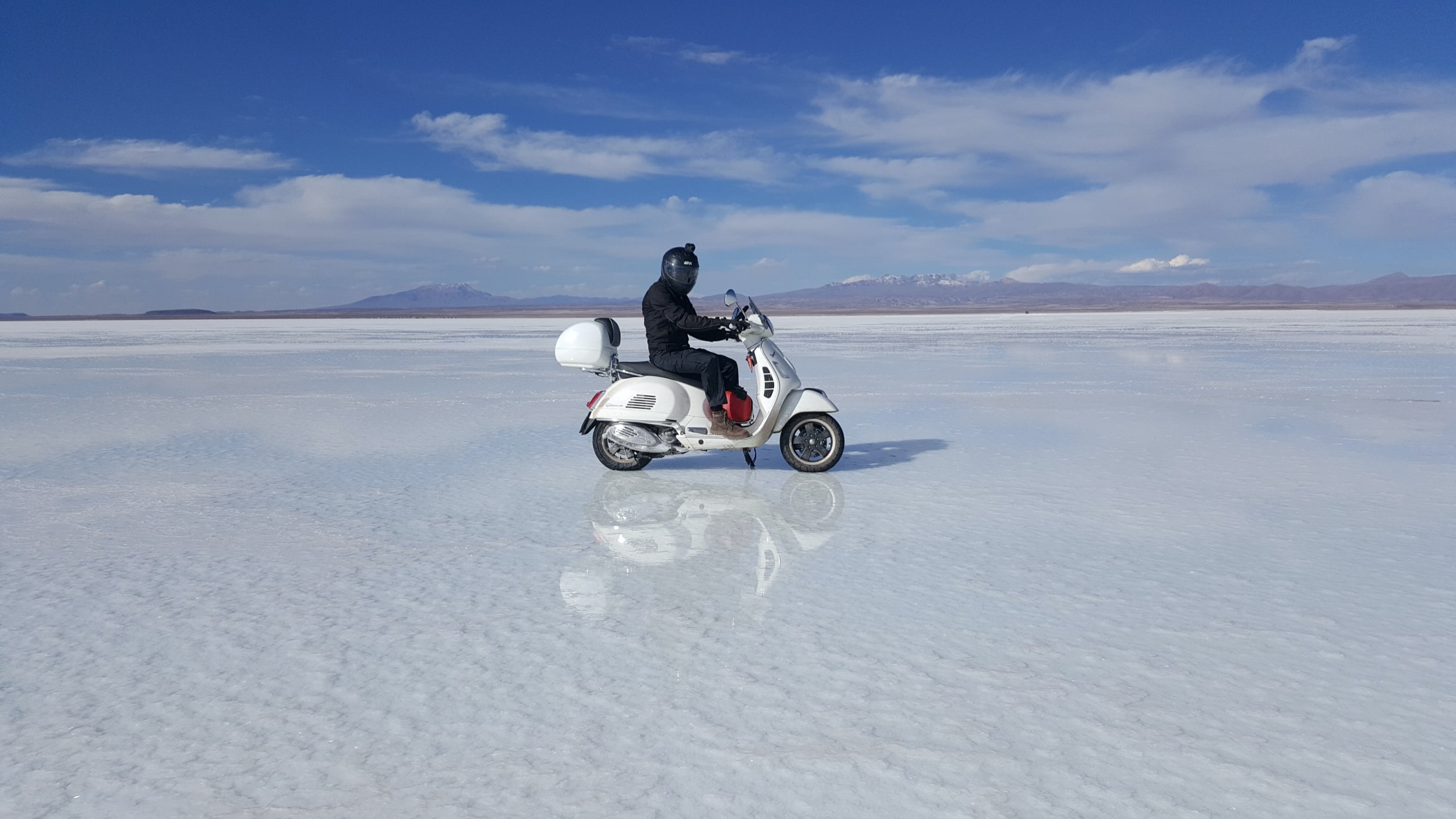 WOW! Che impresa: in Vespa sul deserto più grande e più alto al mondo, chiamato Salar de Uyuni, sull’altopiano della catena montuosa delle Ande in Bolivia. E il protagonista Anibal allega foto bellissime (e divertenti) della sua avventura vissuta, in sella alla sua Vespa GTS, in un luogo unico al mondo, nato dal prosciugamento di un lago preistorico – oltre 3.600 metri d’altitudine per un’estensione di più di 11.500 km quadrati – regno dei fenicotteri rosa. Un suggestivo paesaggio “lunare” dove si perde la dimensione del tempo e dello spazio.