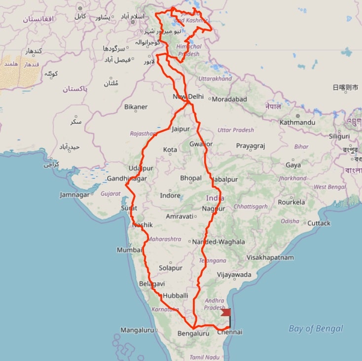 Sono partito da Chennai (Tamil Nadu, India) il 4 giugno 2019 e sono tornato indietro il 13 luglio 2019. Abbiamo viaggiato in circa 15 stati (Tamil Nadu, Karnataka, Maharashtra, Gujarat, Rajasthan, Delhi, Harayana, Punjab, Jammu e Kashmir (ora Diviso), Himachal Pradesh, Chandigarh, Uttar Pradesh, Madhya Pradesh, Andra Pradesh, Telangana. Il drastico cambiamento delle temperature - dai 50° in Rajasthan a -10 in Ladakh - non ci ha impedito di portare a termine questa impresa. Abbiamo avuto l'opportunità di sperimentare cibi, culture e tradizioni diverse attraversando tutta l'India. Un’esperienza indimenticabile”.