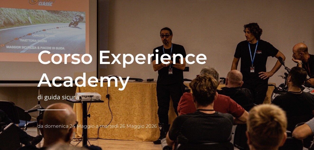 CORSO EXPERIENCE ACADEMY, 24-26 maggio 2026. Tre giorni di corso a Bologna, tra lezioni di teoria in aula e pratica su strada, con gli istruttori del GSSS Team (Guida Dinamica Sicura in Strada):