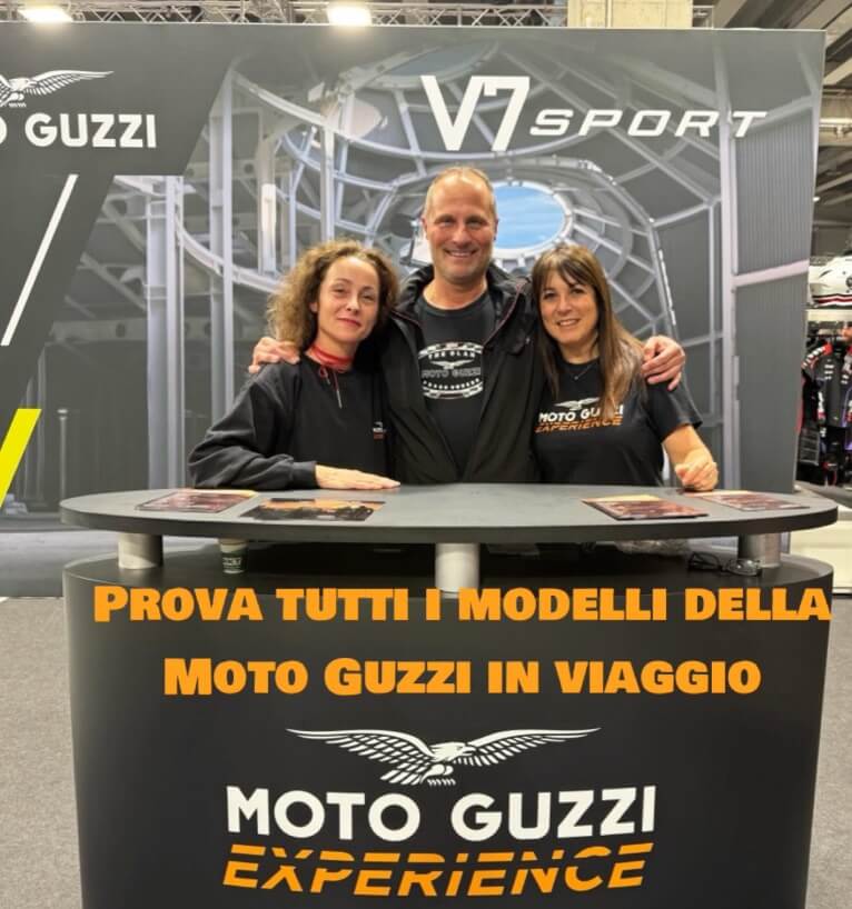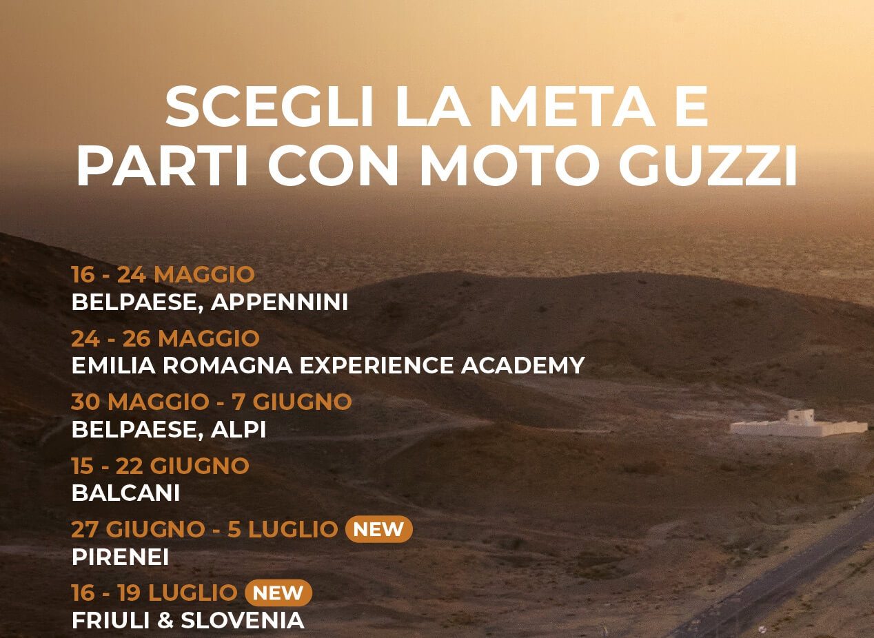 “MOTO GUZZI EXPERIENCE 2026: Partecipa alle nostre MGE, organizzate in collaborazione con il Gruppo Piaggio.Scegli la tua Moto Guzzi dalla nostra flotta, oppure partecipa con la tua Moto Guzzi ad uno dei nostri tour All Inclusive in Italia e nel Mondo.Viaggia da solo oppure insieme al tuo passeggero, con i nostri Tour Leaders e il furgone al seguito per il trasporto dei bagagli e della moto di scorta.Non dovrai preoccuparti di nulla!”.