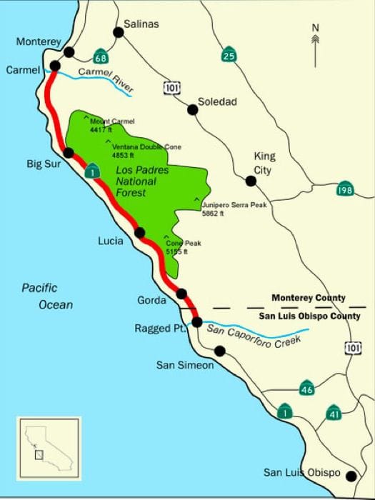 I PUNTI PIU’ BELLI. Il Bixby Bridge sull'omonimo torrente è il punto di partenza per trovare la capanna dove Jack Kerouac, abitò per qualche tempo, alla fine degli anni 1950 e di cui scrisse. Rocky Point è un'area di parcheggio, delle tante dalla quale si può osservare la costa e il Big Sur da lontano. Il ristorante Nepenthe, sulla California 1, 25 chilometri (15 miglia) verso Sud, dopo il Bixby Bridge, vicino a Lucia, è un punto di sosta obbligato, specialmente al tramonto. Le nebbie del Big Sur sono immortalate nelle immagini di molti fotografi.