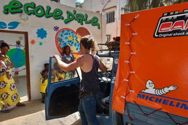 Veicolo vintage ma arzillo, considerando che sta affrontando 10 mila km, attraverso una decina di Paesi, con meta il piccolo villaggio di Kuma Tsame Tosi, in Togo, cui far giungere aiuti umanitari ai bambini e donare l’Ape al team di “Maison sans frontières onlus”. Quest’associazione, nata nel 2013, ha l’obiettivo di aumentare l’autonomia del villaggio a livello energetico e alimentare, puntando su energie rinnovabili e autoproduzioni (agricoltura e artigianato), nonché sull’educazione lavorando in sinergia sia al proprio interno sia con le realtà del territorio.