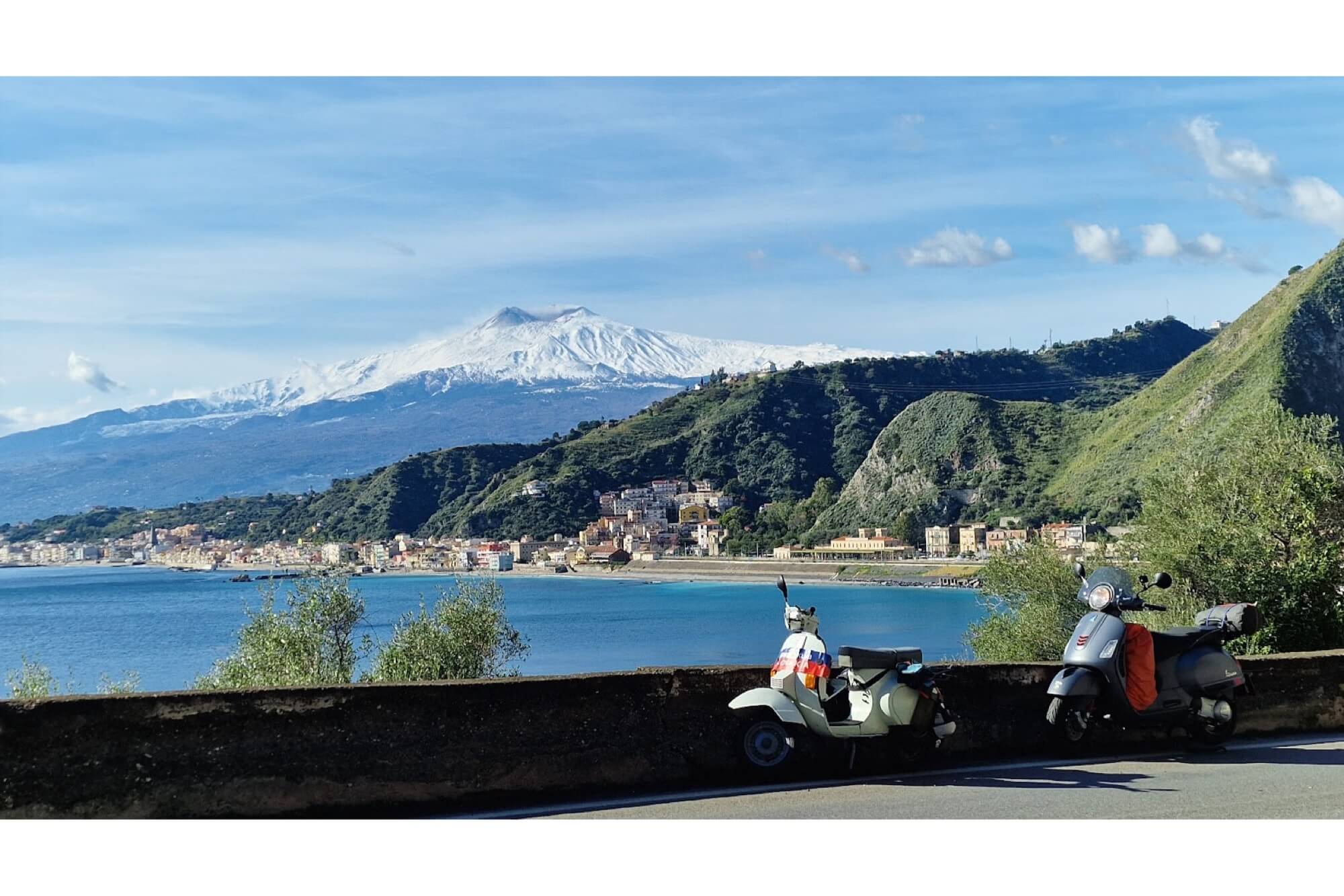 Abbiamo goduto di un meraviglioso sole, di pioggia e, si, perfino della neve in montagna. Abbiamo visitato Palermo (dove abbiamo incontrato il locale Vespa club), così come Corleone, Agrigento, Siracusa, Savoca e la leggendaria Targa Florio (s’intende l’itinerario della rievocazione storica e gara di regolarità per auto d’epoca, tra Palermo e le Madonie, ndr).