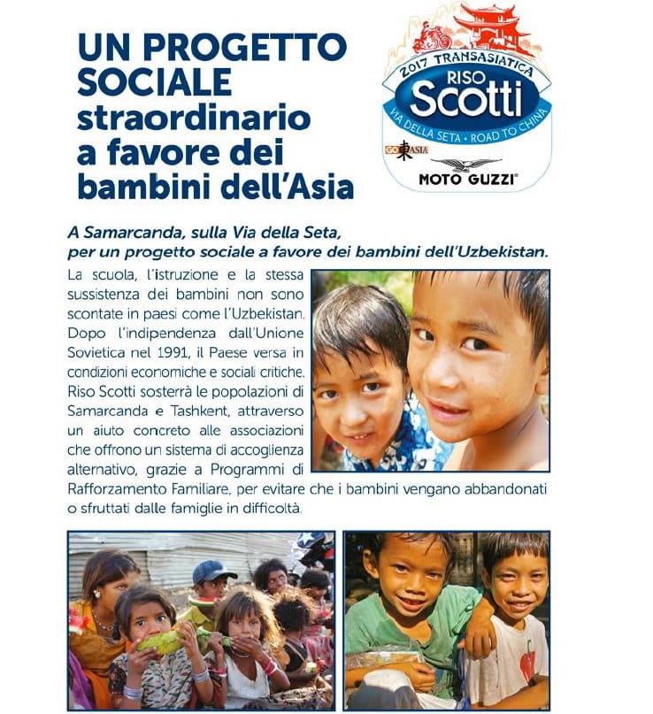 La meta 2017 sarà la Via della Seta e del Riso, dove Riso Scotti porterà un progetto sociale ancora una volta a favore dei bambini. La scuola, l’istruzione e la stessa sussistenza non sono scontate in paesi come l’Uzbekistan. Dopo l’indipendenza dall’Unione Sovietica nel 1991, il Paese versa in condizioni economiche e sociali critiche, così come molti orfanotrofi sopravvivono grazie a donazioni. Per questo motivo, nella sua TransAsiatica 2017, Riso Scotti offrirà un aiuto concreto volto a garantire due pasti al giorno e sostegno all’istruzione alla Casa Accoglienza Mehribonlik di Samarcanda, riconosciuta dal Mistero dell’Istruzione uzbeko, che offre un programma di rafforzamento familiare ad oltre 150 bambini e ragazzi, scongiurando i rischi di abbandono e sfruttamento.