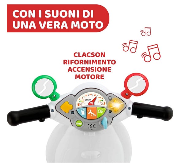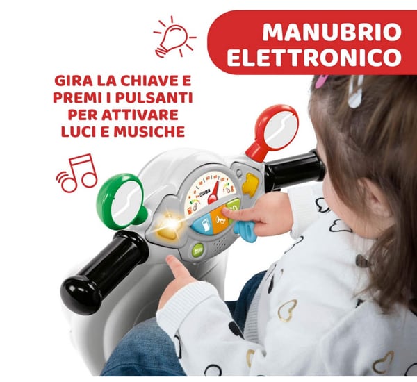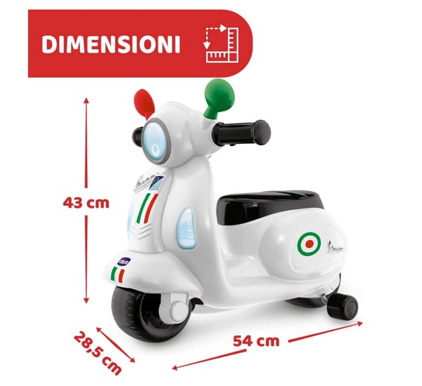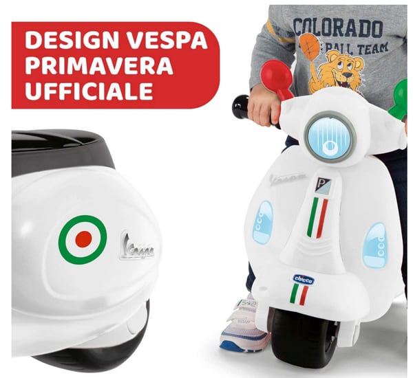 VESPA CHICCO for children, Primavera model, rideable, with electronic panel, lights, and sounds, removable training wheels, for children 1-3 years of age. Colours: white, red, pink.