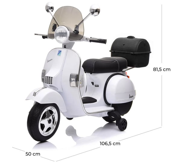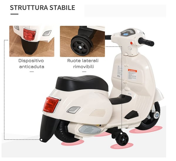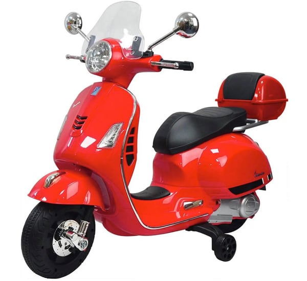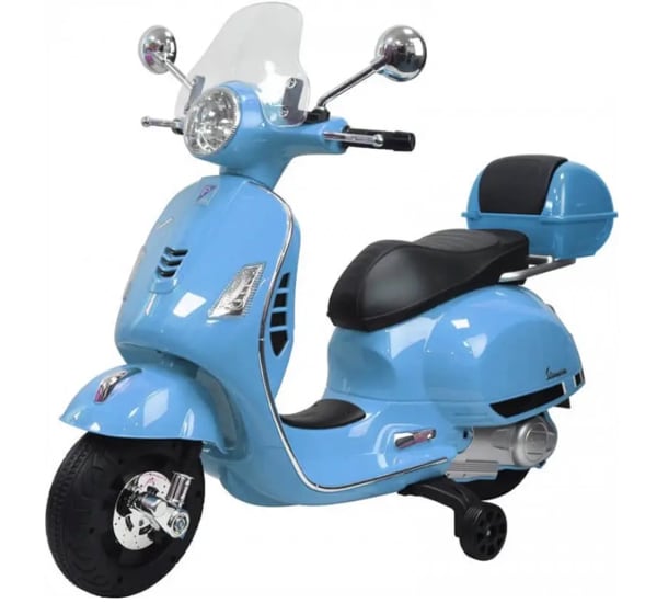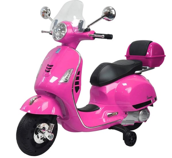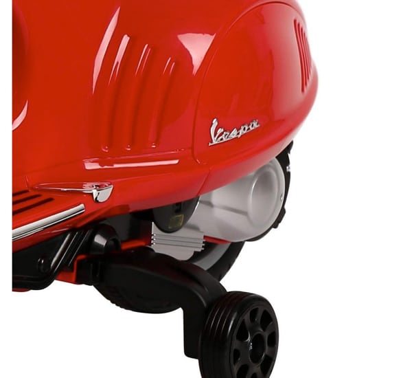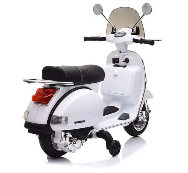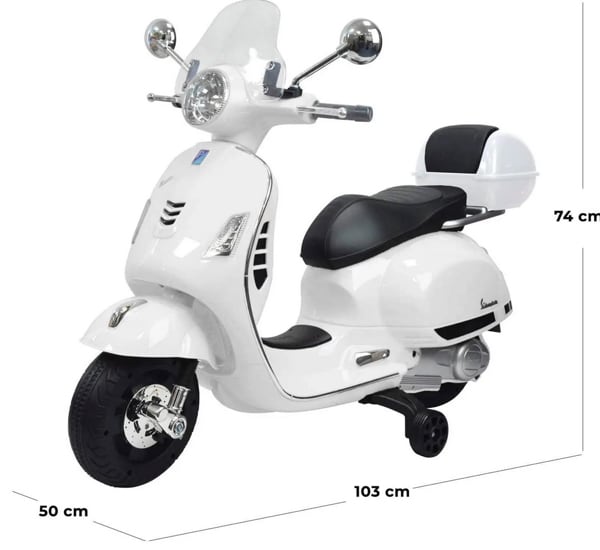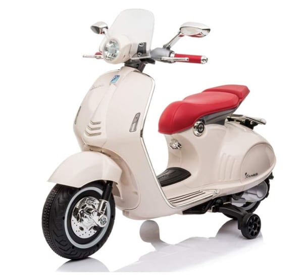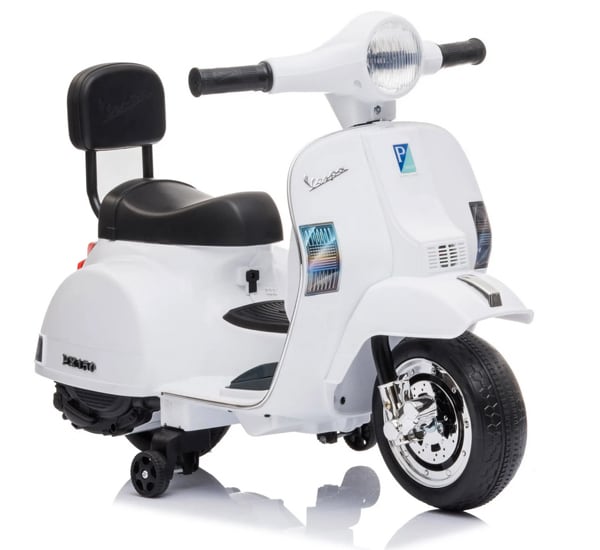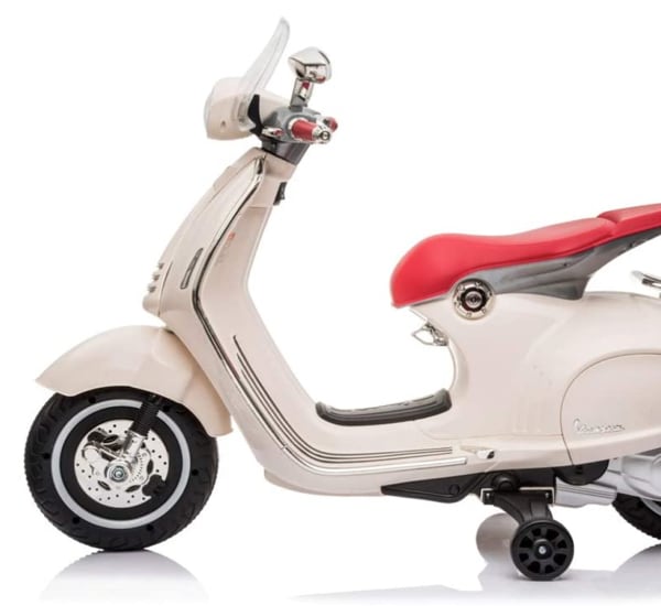 Mini electric Vespa GTS for children, 6V battery: lights and horn, removable training wheels (anti-wear, anti-slip), for children 18-36 months old. Colours: white, red, pink, green. Also with backrest.