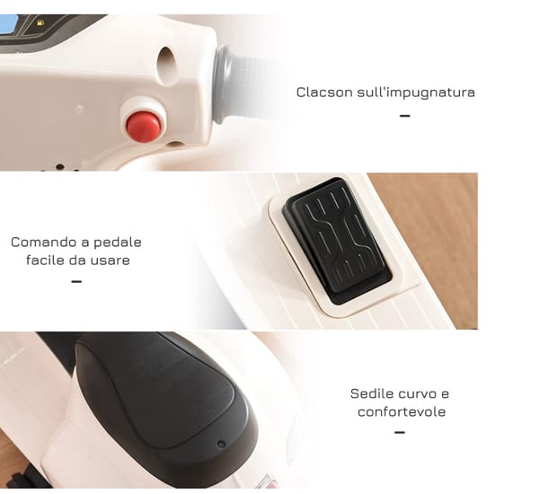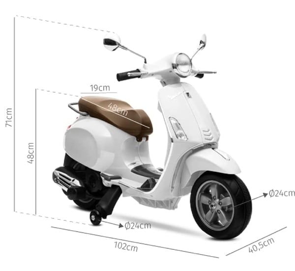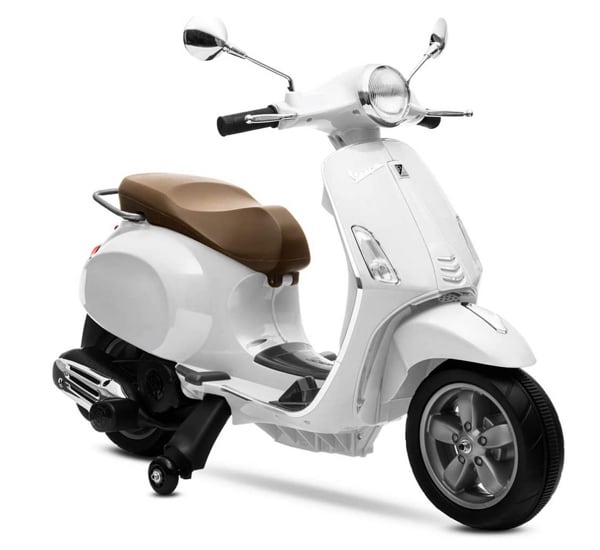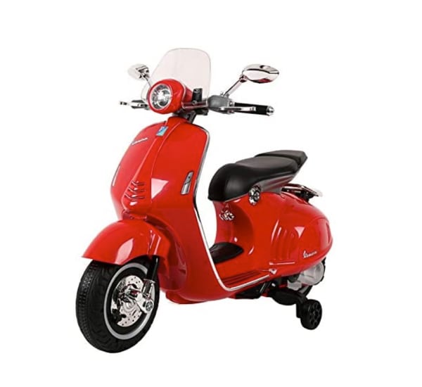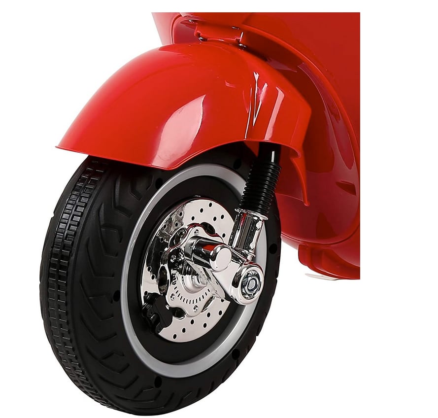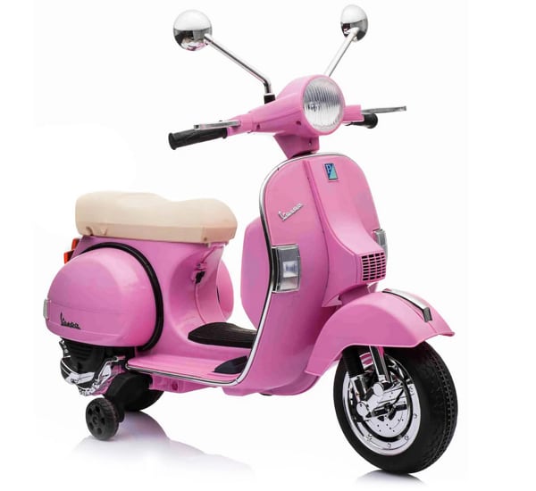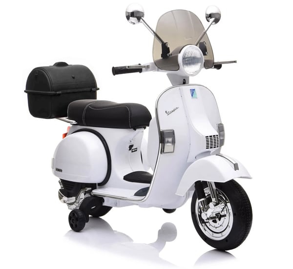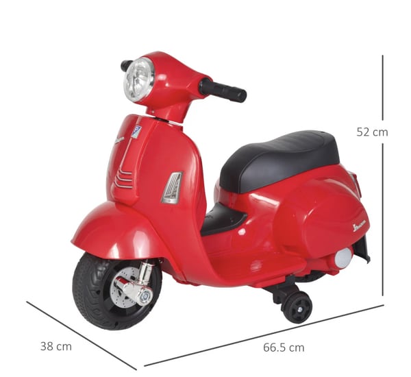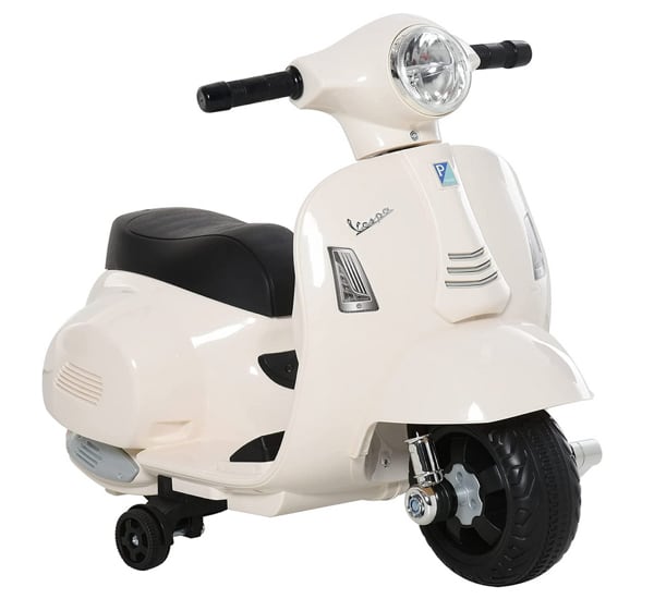 Mini electric Vespa GTS for children, 6V battery: lights and horn, removable training wheels (anti-wear, anti-slip), for children 18-36 months old. Colours: white, red, pink, green. Also with backrest.