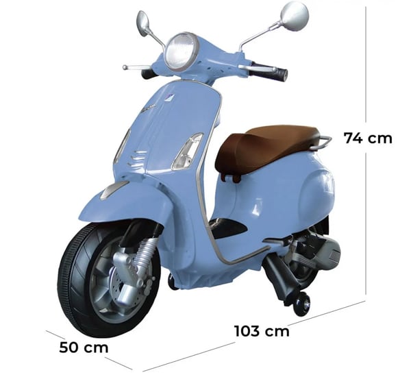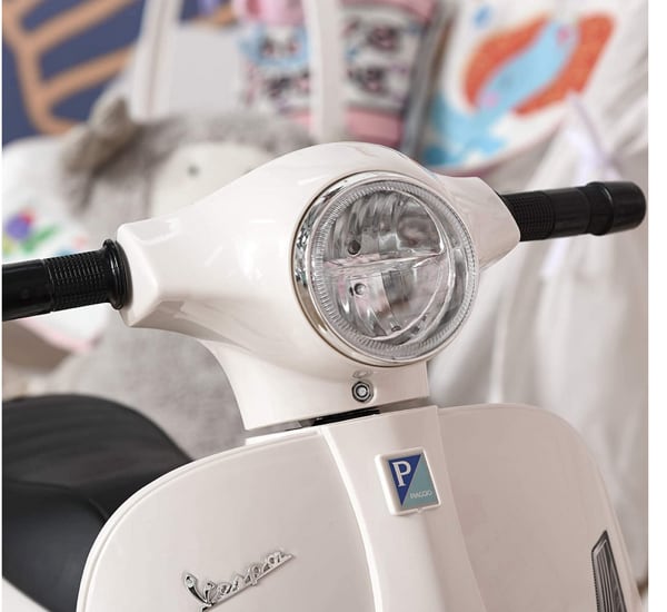 Vespa 6V electric Primavera, rechargeable tricycle, +3 years, openable seat, white colour. Also 12V electric model with light blue livery.