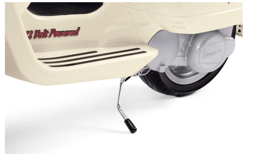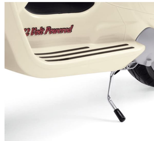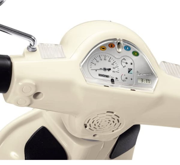 Mini 12V electric Vespa GTS for children. LED lights, music, USB input, TF and Mp3, charge indicator, chromium finish, reverse, with windscreen and top box. Colours: white, red, blue, pink. And there is also a Vespa Granturismo 12V from Peg Perego, with top box: it operates just like a real bike, by twisting the throttle hand grip. Rubber wheels for secure grip on the road, removable training wheels suitable for riders who don’t yet know how to maintain their balance on their own. For ages: 3+.