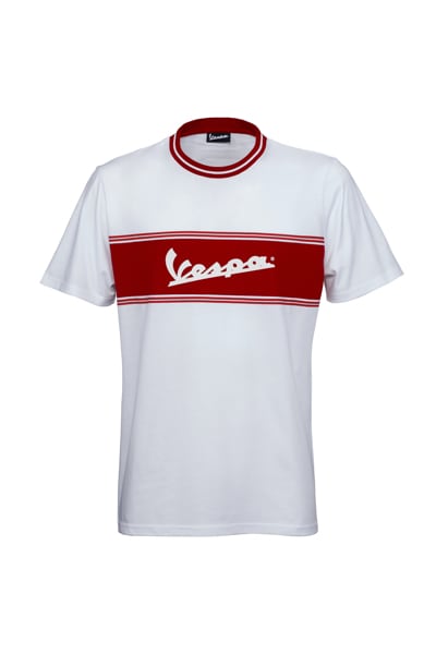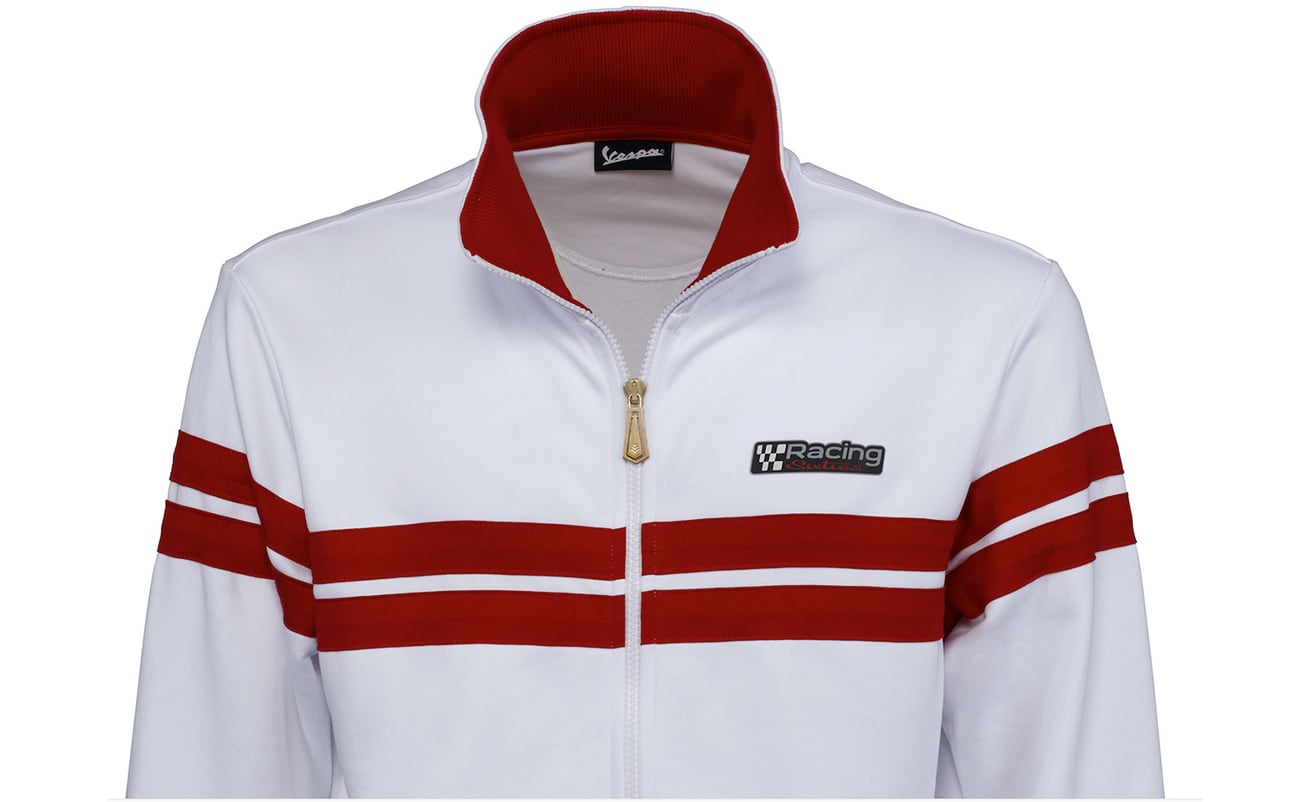 The same spirit lives on in garments in the Vespa Racing Sixties clothing line, in pure cotton with stripes and contrasting logos. The Vespa Racing Sixties Lifestyle Look stands out for the clean washes of colour that emerge thanks to bold front stripes on the t-shirts and sweatshirts, the various graphics of which are reflected in the collar trim and inner sweatband of the t-shirts, and inside the collar and cuffs and around the edges of the sweatshirts, which can be fully opened thanks to the matching zip.